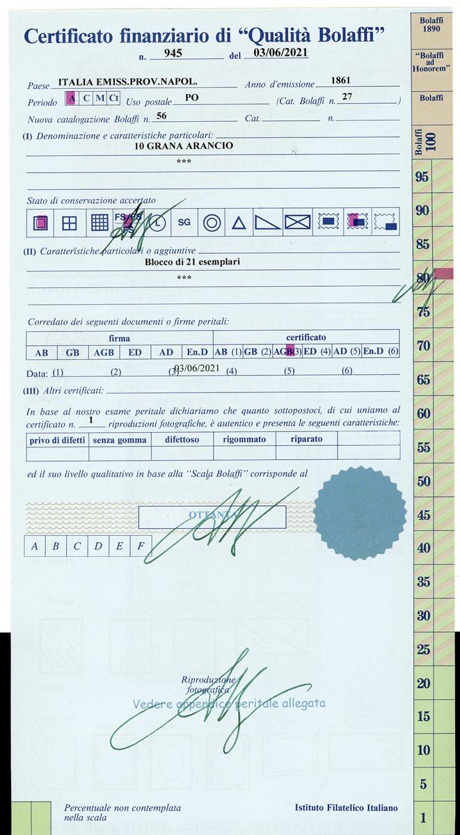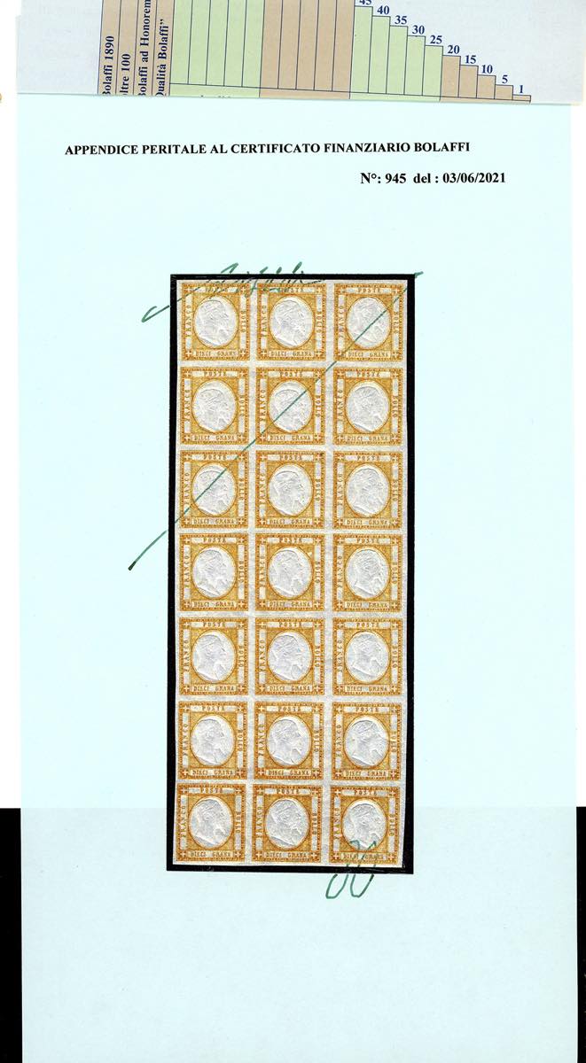 1861 - 10 grana arancio (22), blocco di 21 esemplari, nuovo, gomma originale integra, perfetto. Splendido per freschezza e stato di conservazione. Cert. finanziario Bolaffi 80%.