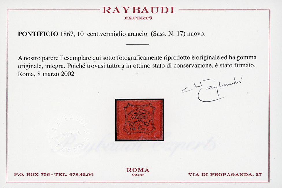 1867 - 10 cent. vermiglio arancio (17), praticamente "otto filetti", nuovo, gomma originale integra, perfetto. Splendido. G.Oliva, A.Diena, cert. Raybaudi.