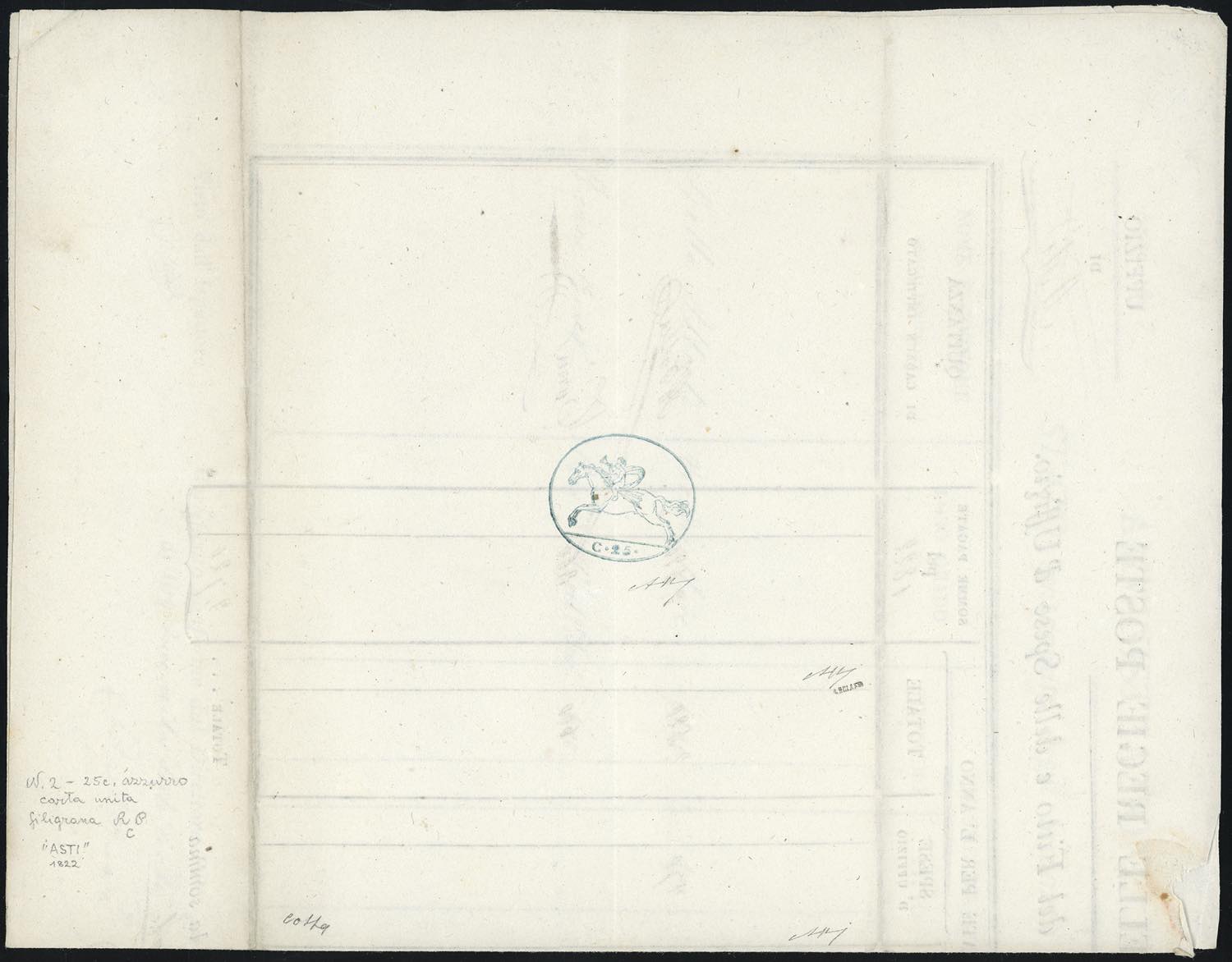 1822 - 25 cent. Cavallino, impressione a stampa, foglio doppio con stampa tipografica all'interno (2A), usato dall'Amministrazione delle Poste per servizio interno ad Asti nel 1822, molto fresco, lieve consueta piega sull'impronta. Firmato Colla, cert. "Parola scritta" Bolaffi.