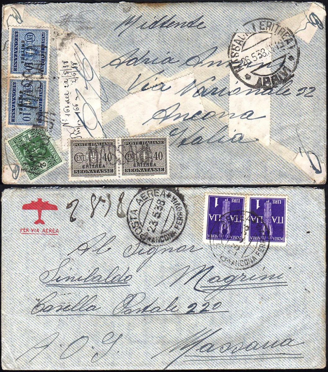 SEGNATASSE 1938 - 10 cent. azzurro, coppia, 40 cent. grigio, coppia, 2 lire verde (27,31,35), perfetti, al verso di busta da Ancona 23/5/1938 a Massaua, tassata per fermo posta. Eccezionale tassazione tricolore! Rarità. Ferrario.