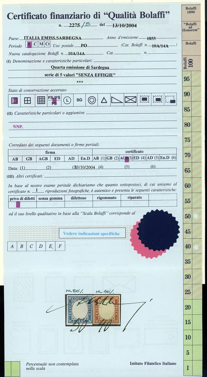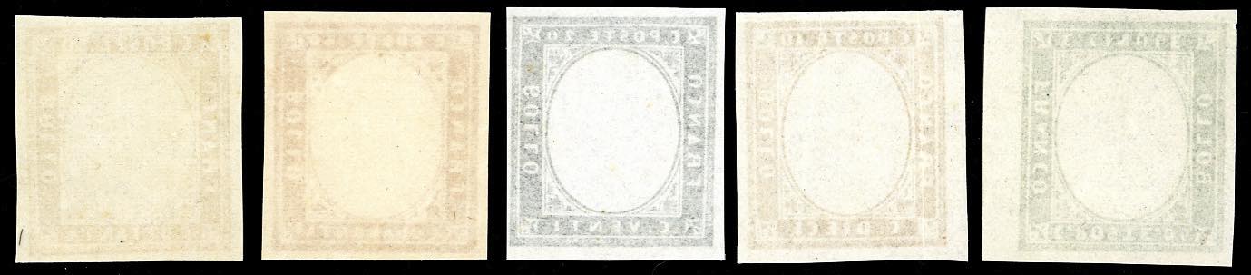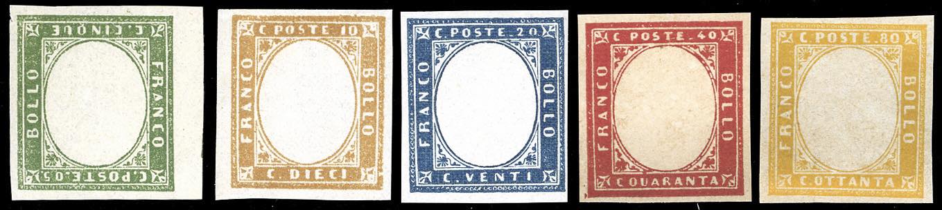 1863 - Quarta emissione, serie di cinque valori fino all'80 cent., tutti SENZA EFFIGIE, francobolli naturali (Bol10B/14B), nuovi, gomma originale integra, perfetti ad eccezione del 10 cent, che presenta una lieve grinza di gomma verticale. Rari e molto freschi. Cert. finanziario Bolaffi per il 20 e il 40 cent.