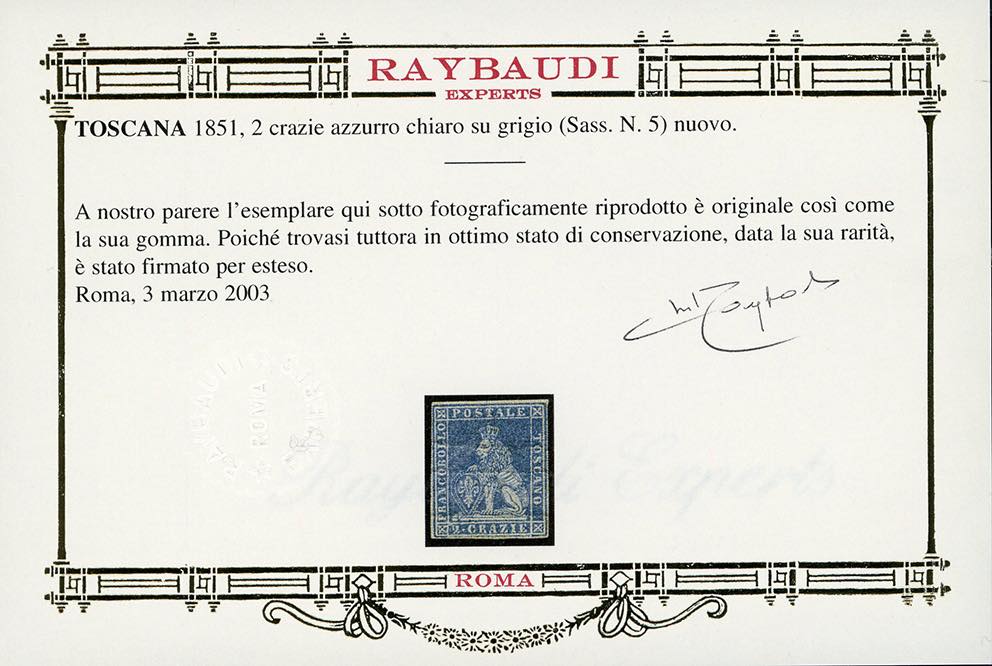 1851 - 2 crazie azzurro chiaro su grigio (5), nuovo, gomma originale, perfetto e con margini bianchi completi su tutti i lati. Raro e molto fresco. G.Oliva, cert. Oro Raybaudi.