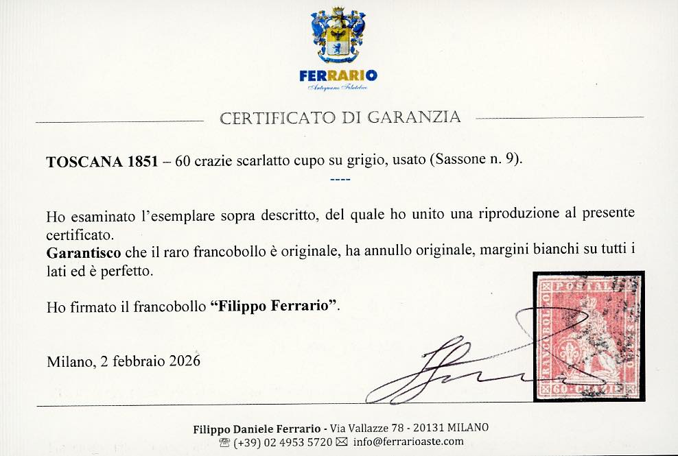 1851 - 60 crazie scarlatto su grigio (9), usato, perfetto e con margini bianchi su tutti i lati. Molto raro, specie in queste condizione ... Leggi tutto