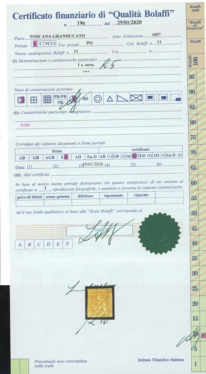 1857 - 1 soldo ocra, filigrana linee ondulate (11), nuovo, gomma originale, tre buoni margini, completo il superiore, lieve punto di assottigliamento al verso. Molto raro, di grande freschezza e ottimo aspetto. Firmato Emilio Diena, cert. finanziario Bolaffi.