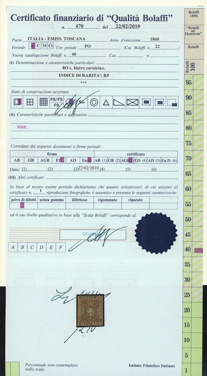 1860 - 80 cent. carnicino (22), nuovo, gomma originale, piccola e leggera traccia di linguella, perfetto.
