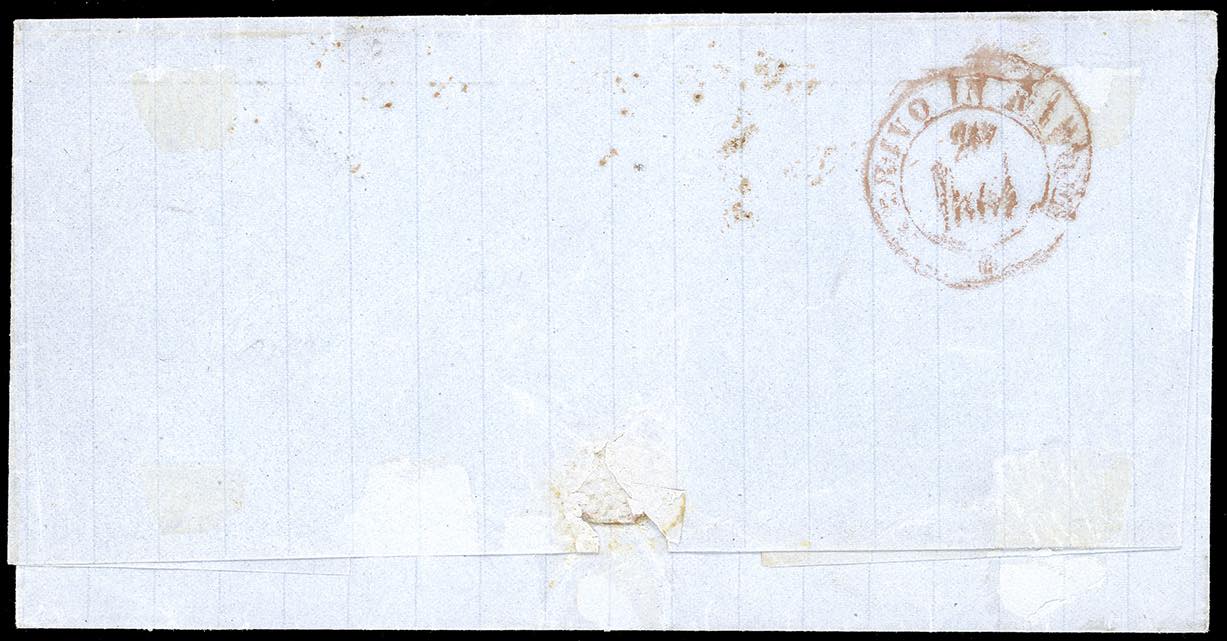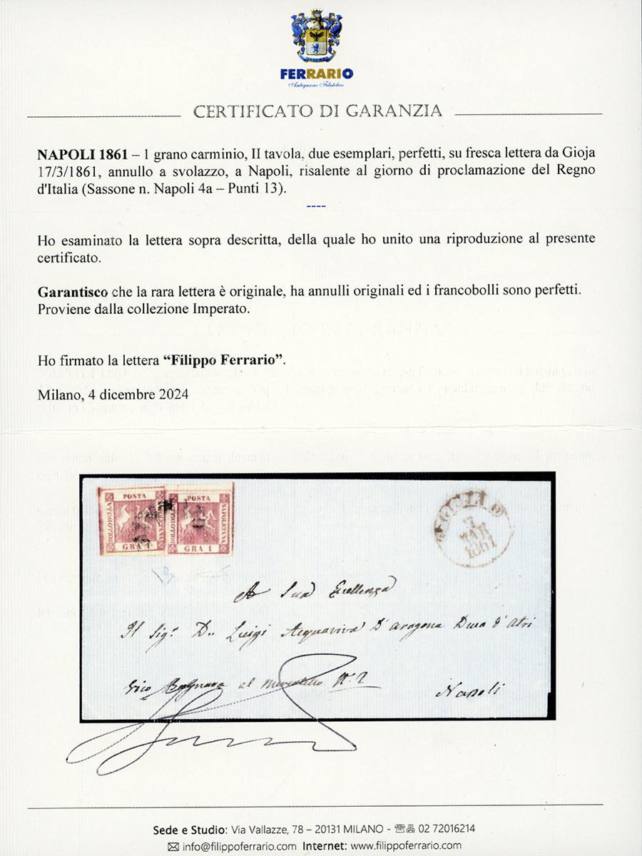1861 - 1 grano carminio, II tavola (4a), due esemplari, perfetti, su fresca lettera da Gioja 17 marzo 1861, GIORNO DELLA PROCLAMAZIONE DEL REGNO D'ITALIA, annullo a svolazzo (punti 13), a Napoli. Splendida e rara. Enzo Diena, cert. Ferrario.