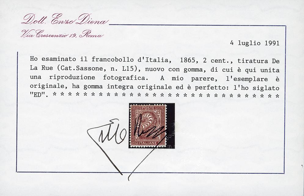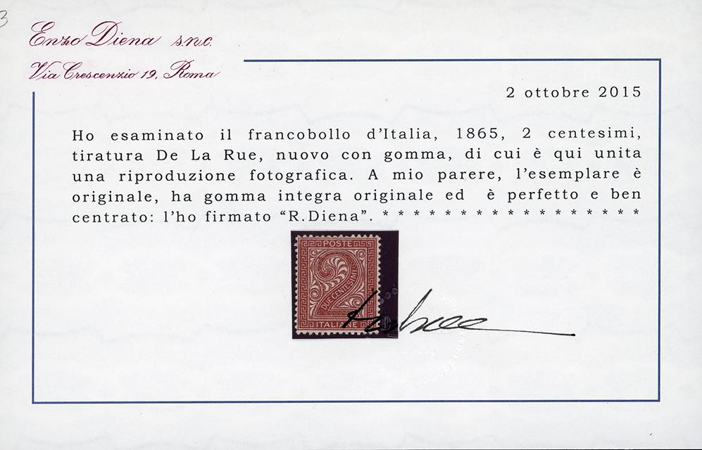 1865 - 2 cent. De La Rue, tiratura di Londra (L15), buona/ottima centratura, nuovo, gomma originale integra, perfetto e molto fresco. Firmato Fiecchi, cert. Enzo Diena.