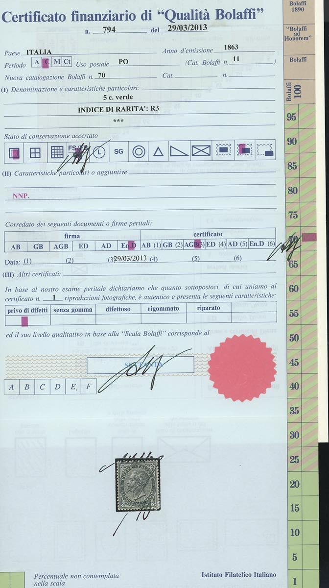 1863 - 5 cent. De La Rue, tiratura di Londra (L16), ben centrato, nuovo, gomma originale integra, perfetto e molto fresco. Ottima qualità. Firmato Sassone, E.Diena, Colla, Fiecchi, cert. finanziario Bolaffi.