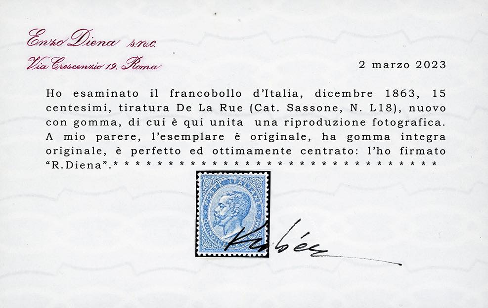 1863 - 15 cent. De La Rue (L18), ottima centratura, nuovo, gomma originale integra, perfetto e di ottima qualità. Raro, freschezza eccezionale. Firmato G.Oliva, A.Diena, cert. Diena e Ferrario.