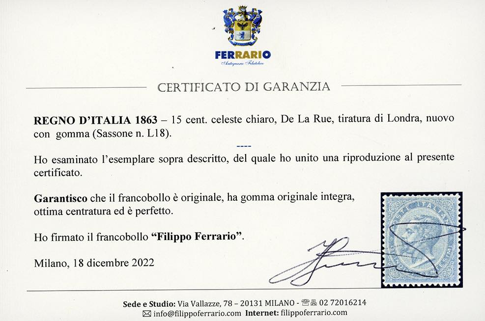 Lotto 137 - 1863 - 15 cent. De La Rue (L18), ottima centratura, nuovo, ...