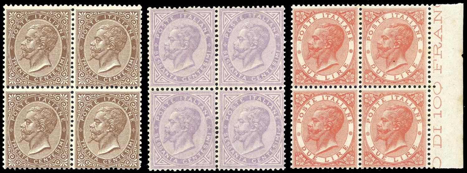 1866 - 30 cent., 60 cent. e 2 lire De La Rue, tiratura di Torino (T19,T20,T21), blocchi di quattro, nuovi, gomma originale integra, perfetti.