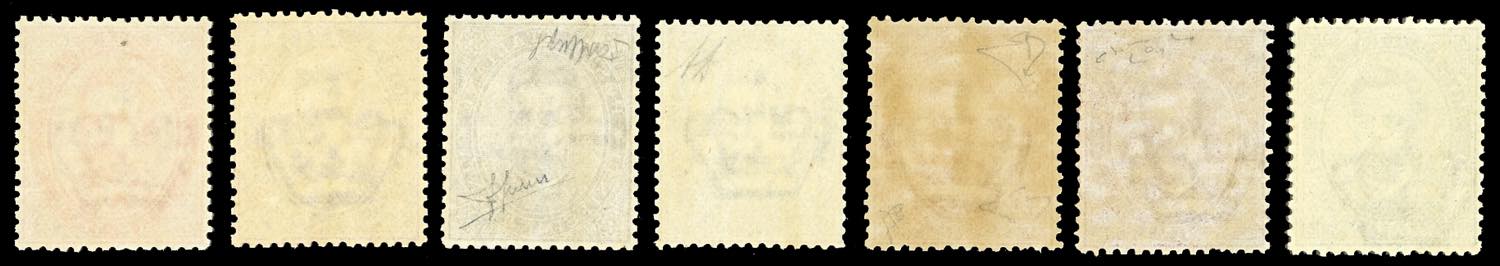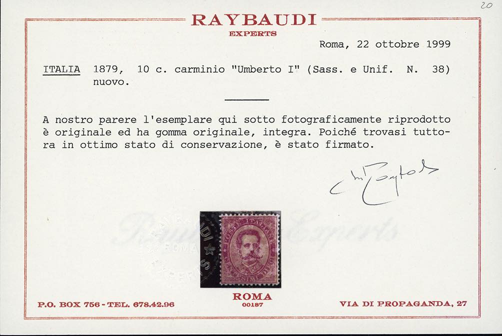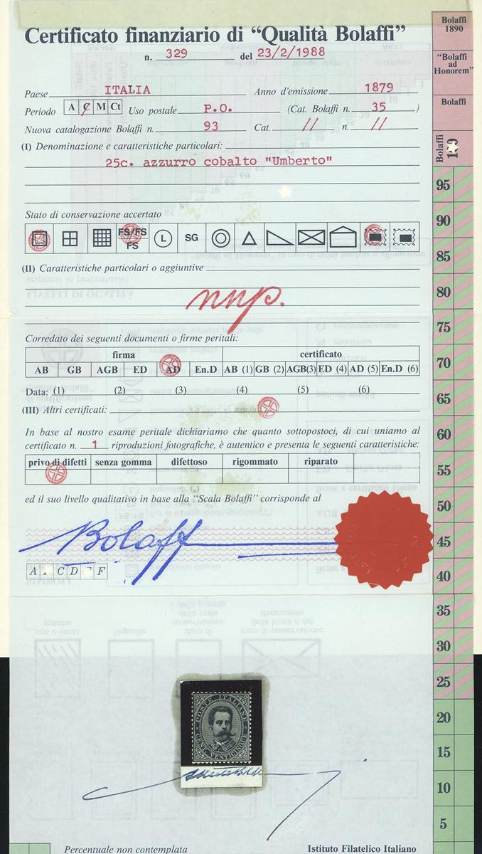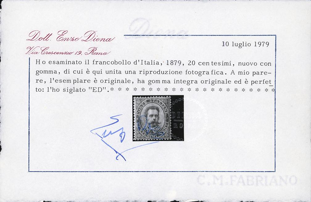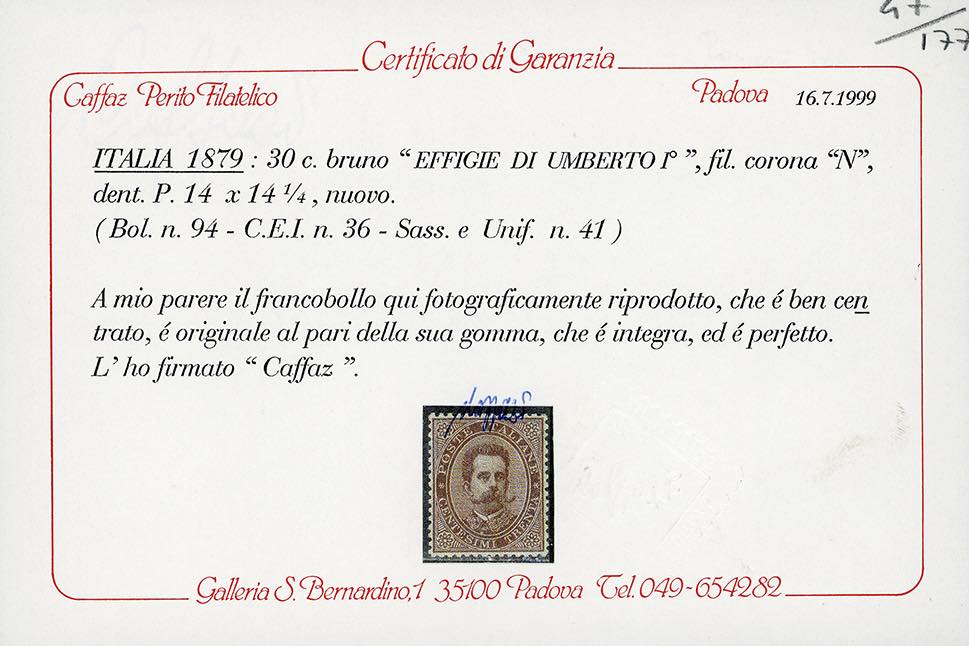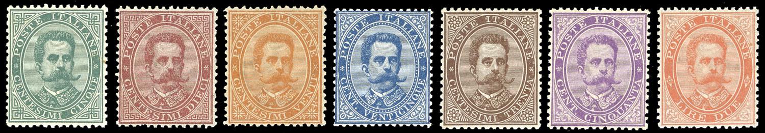 1879 - Umberto I, prima emissione, serie completa (37/43), ottima centratura, nuovi, gomma originale integra, perfetti e di ottima qualità. Cert. Raybaudi per il 10 cent., cert. E.Diena e cert. finaziario Bolaffi 100% per il 25 cent., Sorani e cert. Caffaz per il 30 cent.