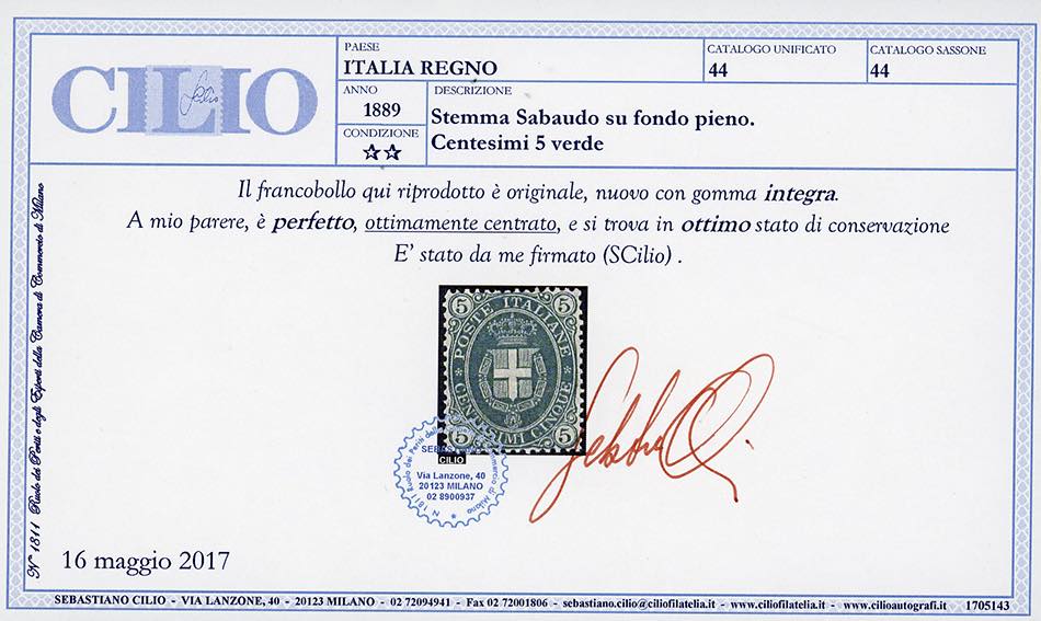1889 - 5 cent. Stemma, fondo pieno (44), ottima centratura, nuovo, gomma originale integra, perfetto. Splendido e raro in queste eccellenti condizioni qualitative. Cert. Cilio.