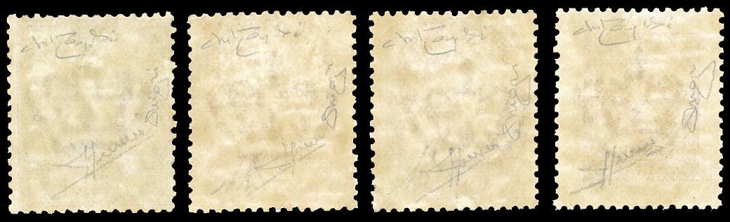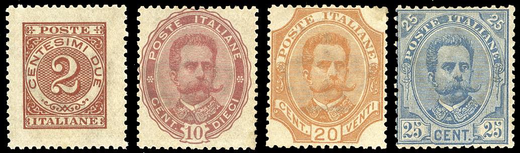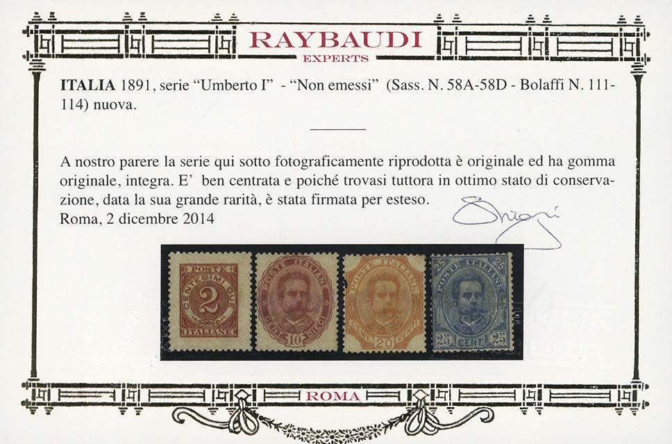 1891 - Umberto I, non emessi, serie completa (58A/58D), buona/ottima centratura, nuovi, gomma originale integra, perfetti e di ottima qualità. Una delle serie più rare del Regno d'Italia. A.Diena per i n. 58 B e 58 C, la serie firmata Sorani e due cert. Oro Raybaudi.