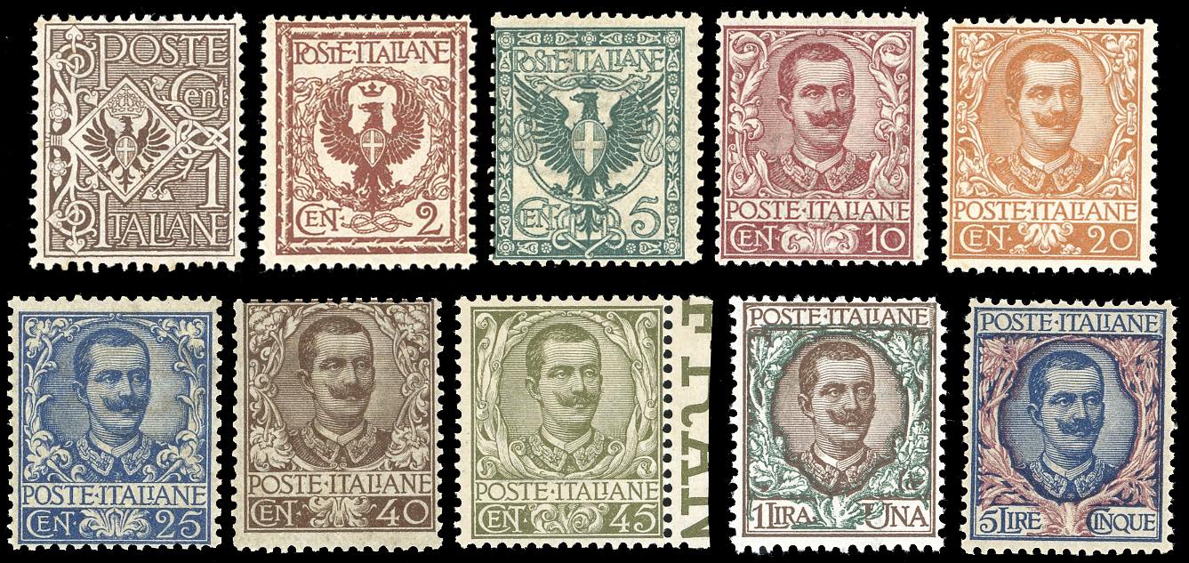 1901 - Floreale, serie senza il 50 lire (68/75,77,78), nuovi, gomma originale integra, perfetti. Cert. finanziario Bolaffi per il 10 cent., ... Leggi tutto