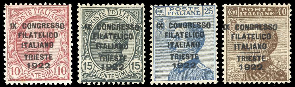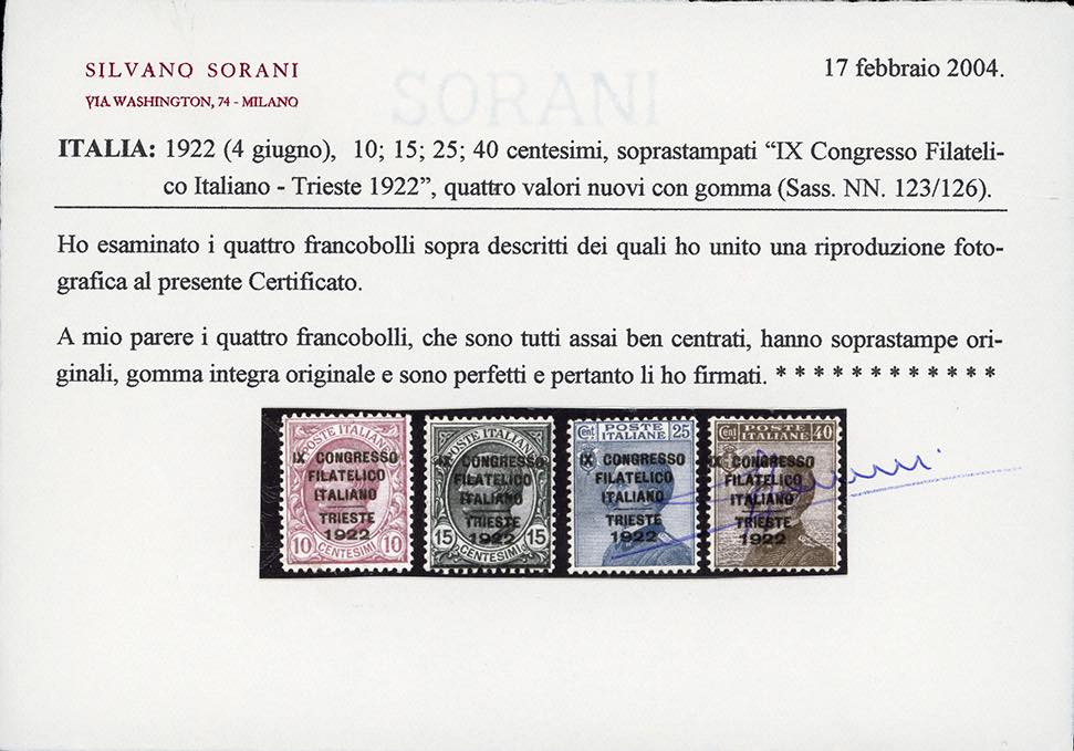1922 - Congresso Filatelico, serie completa (123/126), ottima centratura, nuovi, gomma originale integra, perfetti. Rari in questa splendida condizione qualitativa. Enzo Diena, Angelo Zanaria, cert. Bottacchi e Sorani.