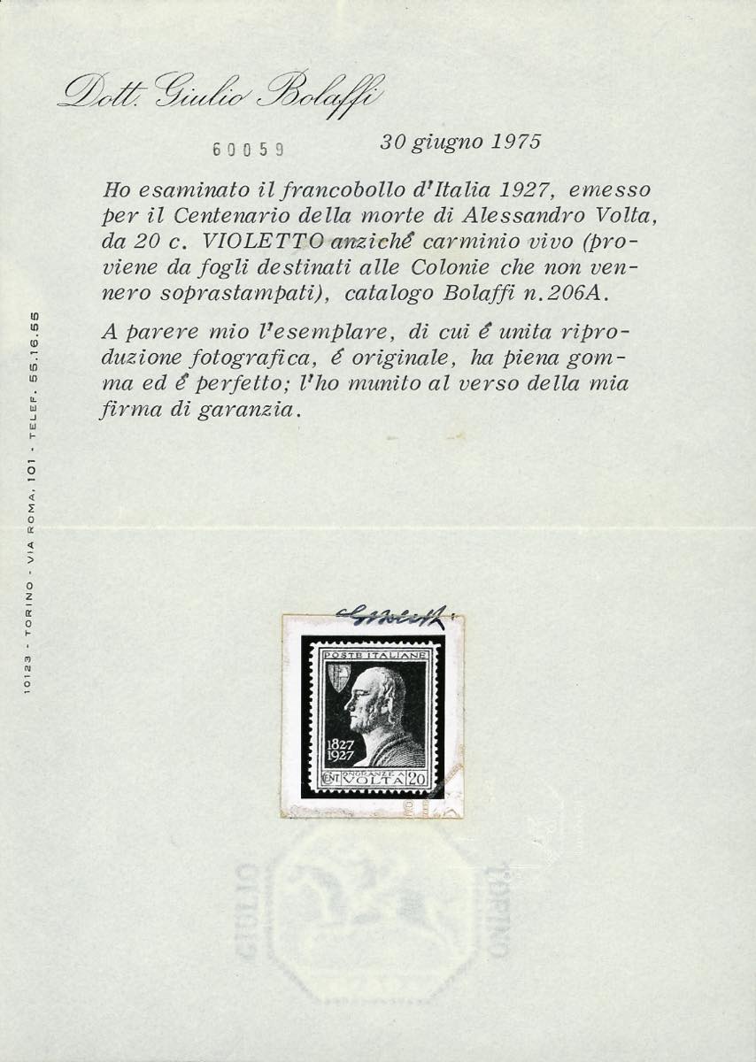 1927 - 20 cent. Volta Violetto, errore di colore (210A), ben centrato, nuovo, gomma originale integra, perfetto e molto fresco. Raro e di ottima qualità. Cert. G.Bolaffi.