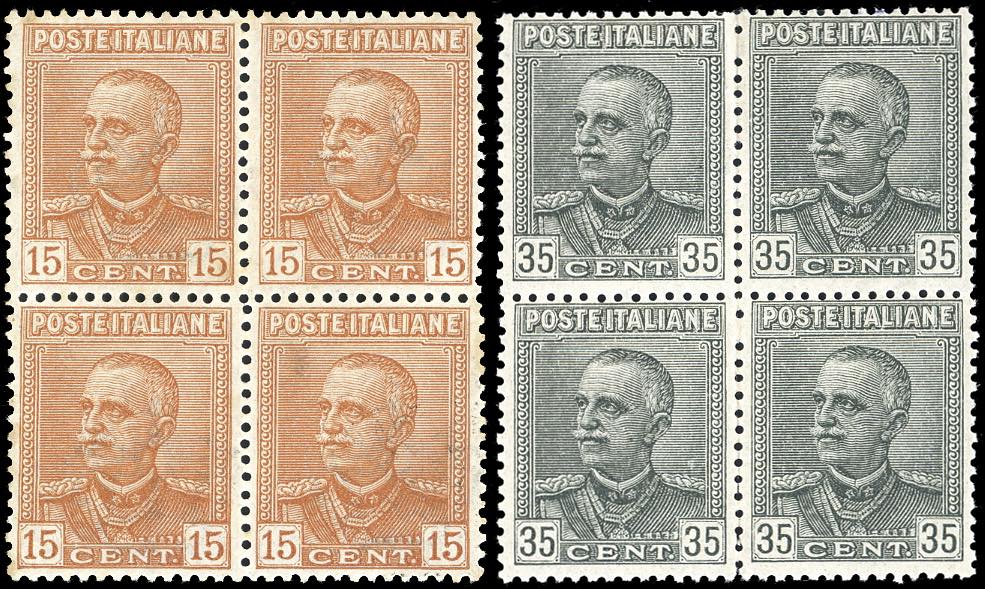 1929 - 15 e 35 cent. Parmeggiani, serie completa (240/241), ben centrati, blocchi di quattro, nuovi, gomma originale integra, perfetti. Ferrario.
