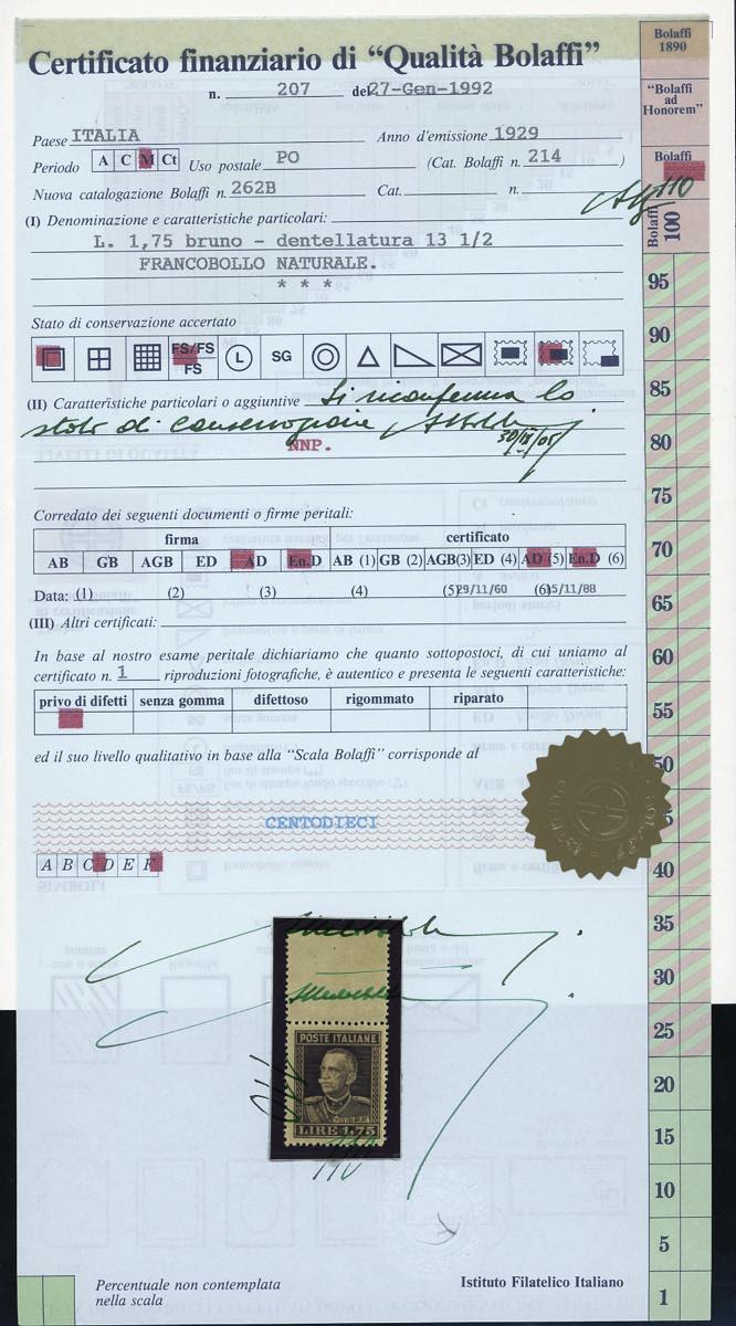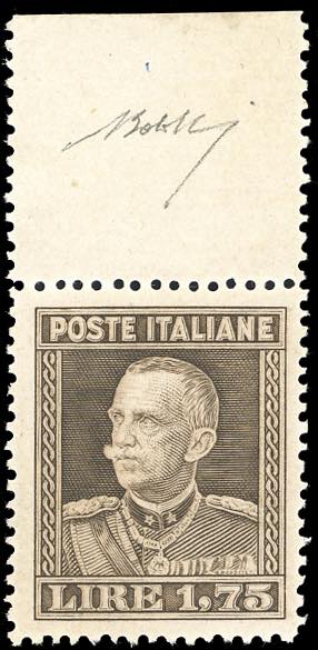 1929 - 1,75 lire bruno Vittorio Emanuele III, dent. 13 3/4 (Sass.242, Bol. 262B francobollo naturale), ben centrato, bordo di foglio in alto, nuovo, gomma originale integra, perfetto e molto fresco. Splendido e raro in queste eccezionali condizioni qualitative. Firmato G.Bolaffi, G.Oliva, Alberto ed Enzo Diena, cert. finanziario Bolaffi 110%.