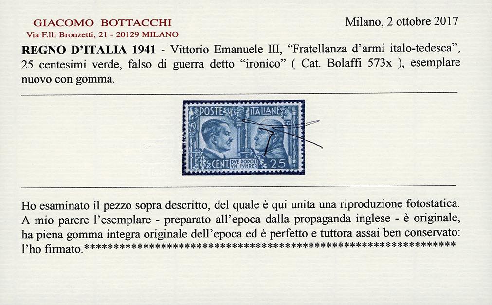 1941 - 25 cent. Fratellanza d'armi, imitazione di guerra (IG454), nuovo, gomma originale integra, perfetto e di ottima qualità. Raro. Chiavarello, cert. Bottacchi.
