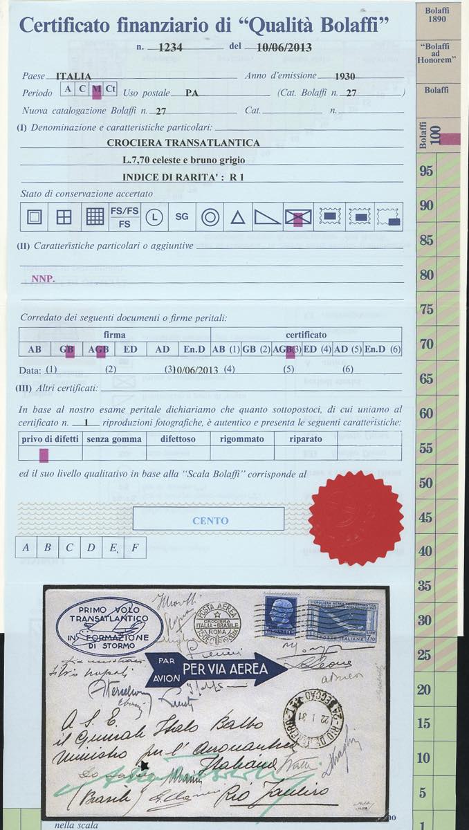 1930 - 7,70 lire Crociera Balbo e 1,25 lire Imperiale (A25,253), perfetti, su aerogramma da Roma 15/12/1930 a Rio de Janeiro, con le firme di 18 piloti, bollo speciale e d'arrivo. Bellissimo. Giulio Bolaffi e cert. finanziario Bolaffi 100%.
