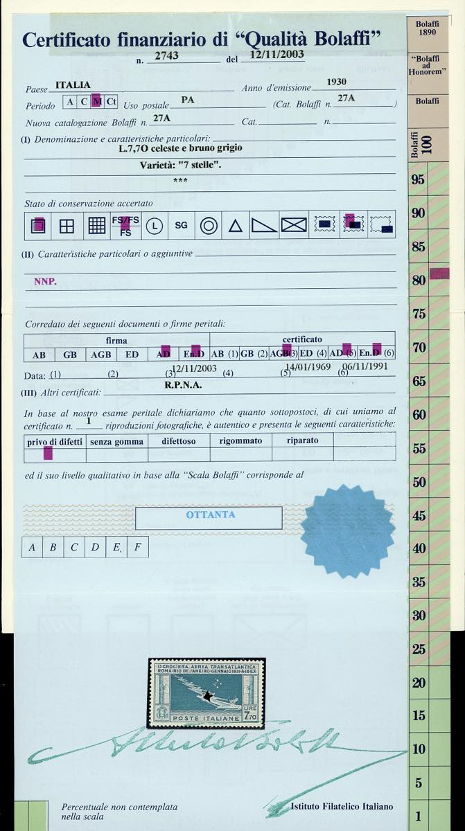 1930 - 7,70 lire Crociera Balbo, varietà "sette stelle" (25a), ben centrato, nuovo, gomma originale integra, perfetto. Alberto ed Enzo Diena, cert. finanziario Bolaffi 80%.