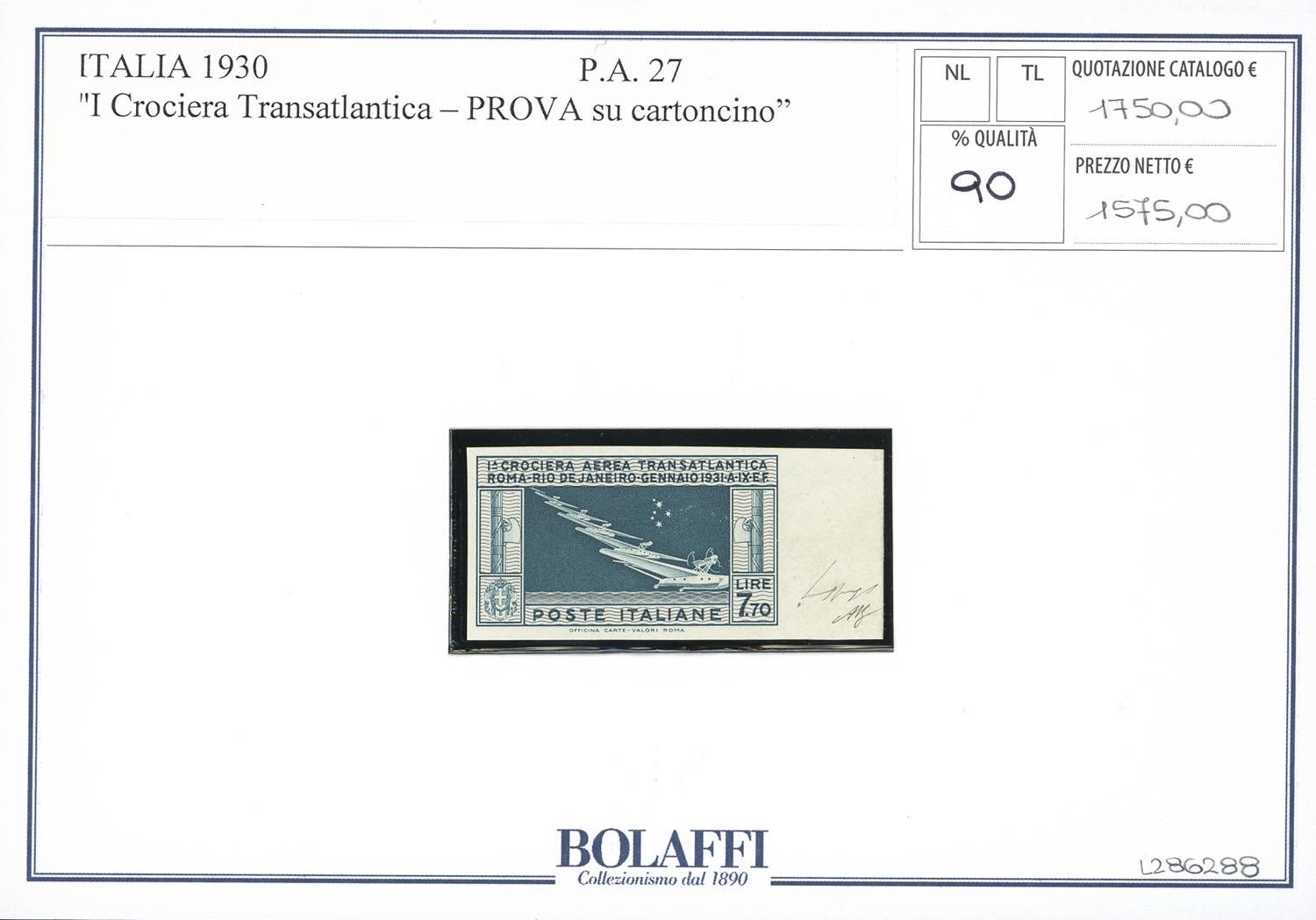1930 - 7,70 lire Crociera Balbo, prova d'archivio su cartoncino patinato, non dentellata e senza gomma, come sempre (P25), perfetta e bordo di foglio. A.Diena, cert. finanziario Bolaffi 90%.