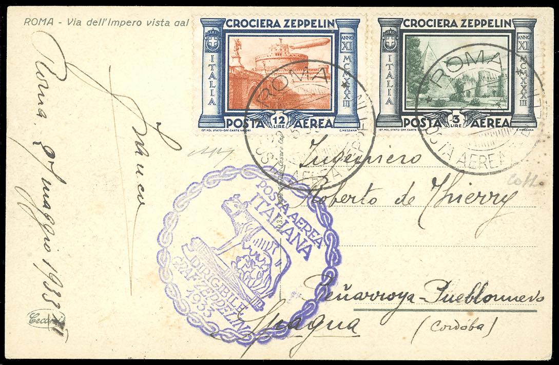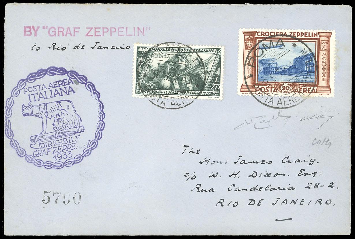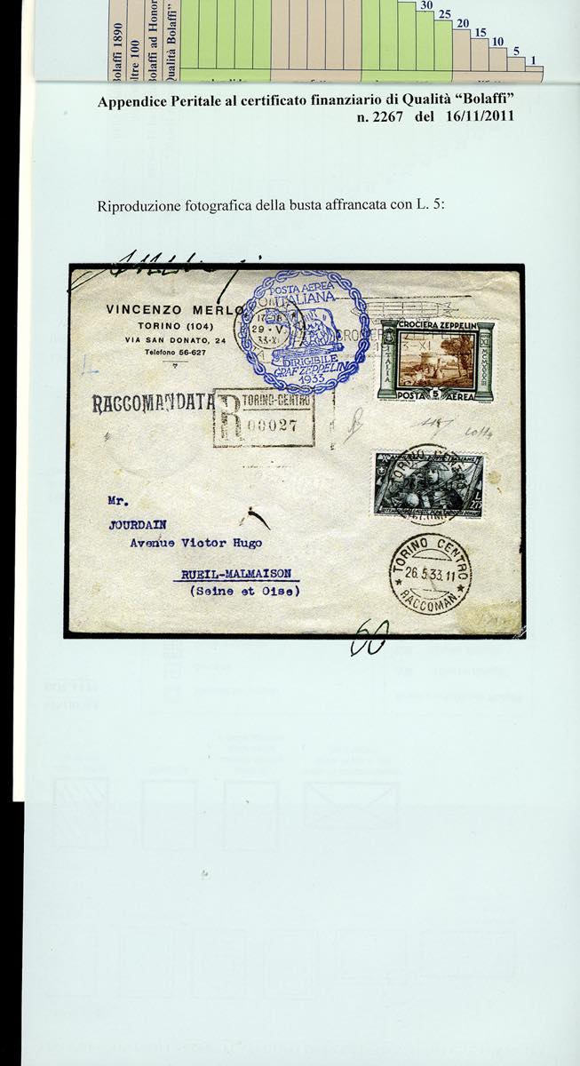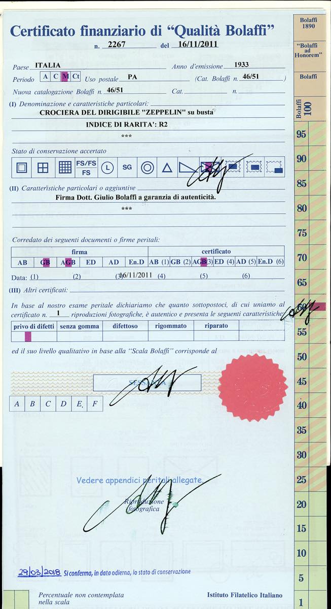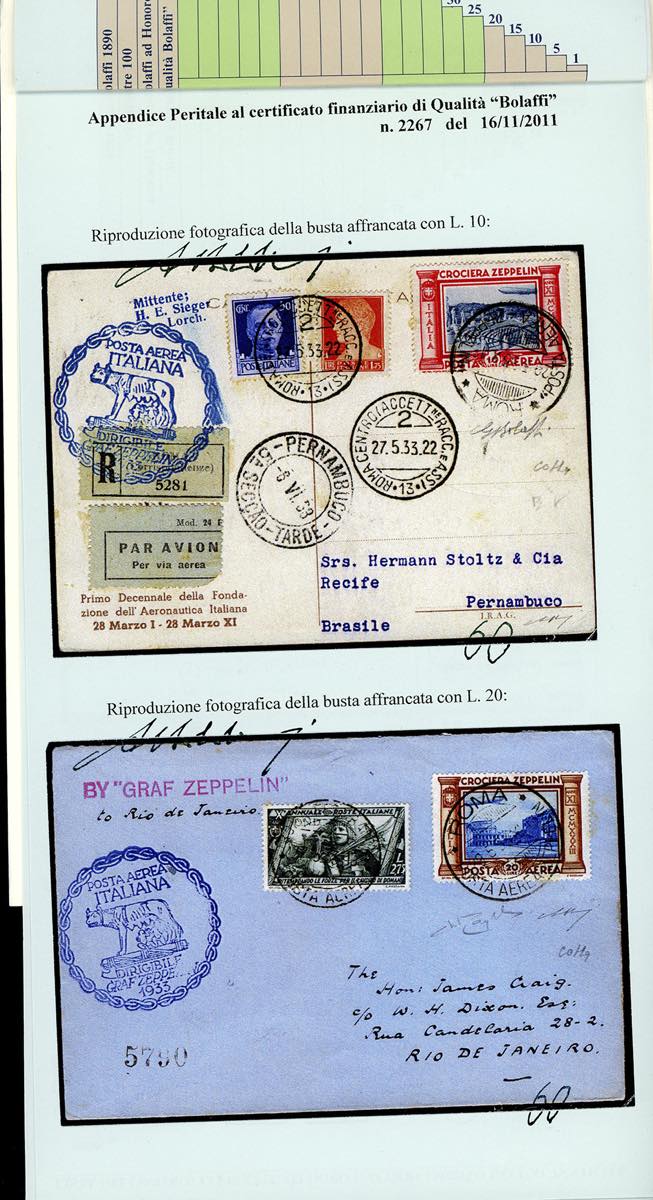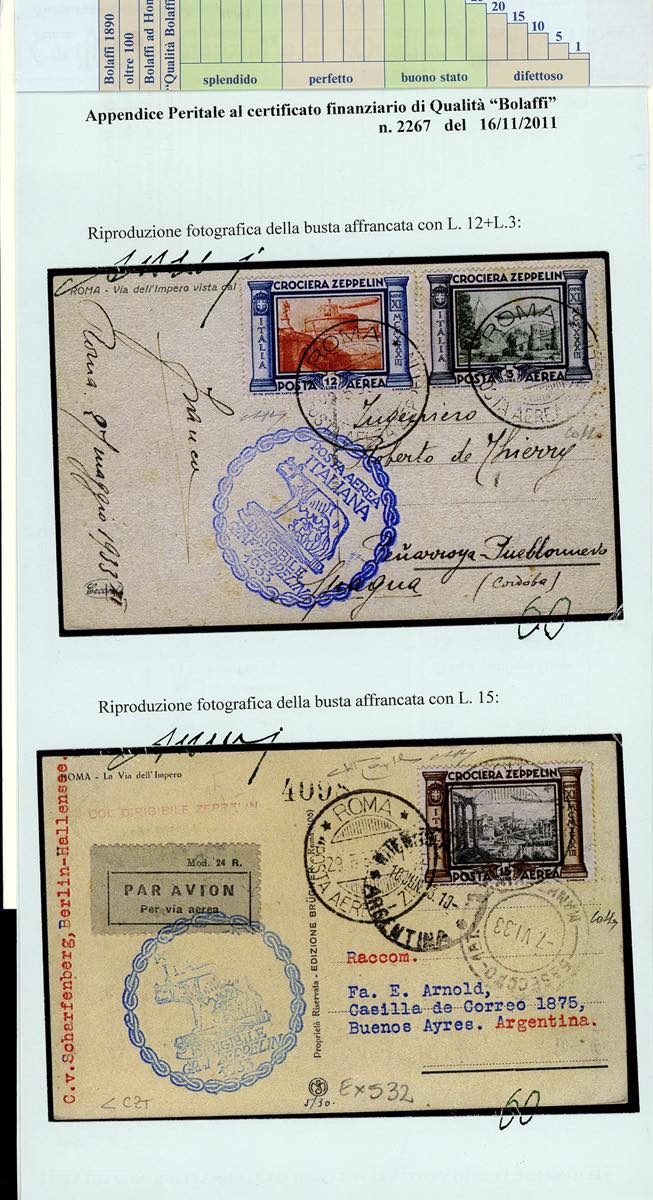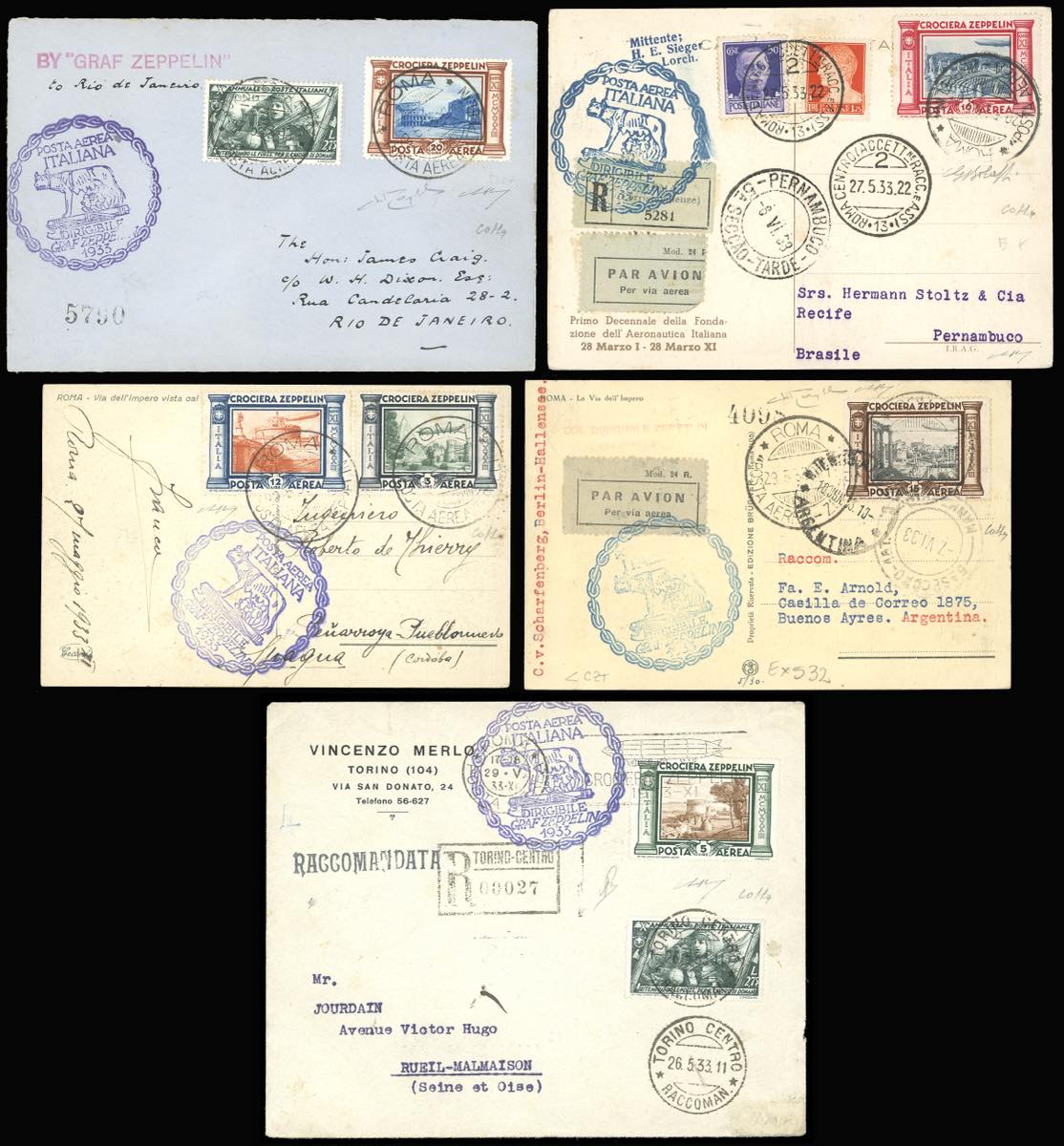 1933 - Crociera Zeppelin, serie completa (A45/A50), con valori complementari, su 5 aerogrammi da Roma, viaggiati con il Graf Zeppelin, diretti in Spagna, Argentina, Francia e due in Brasile. Ottima qualità. Firmati Colla/Bolaffi/Raybaudi. Cert. finanziario Bolaffi.