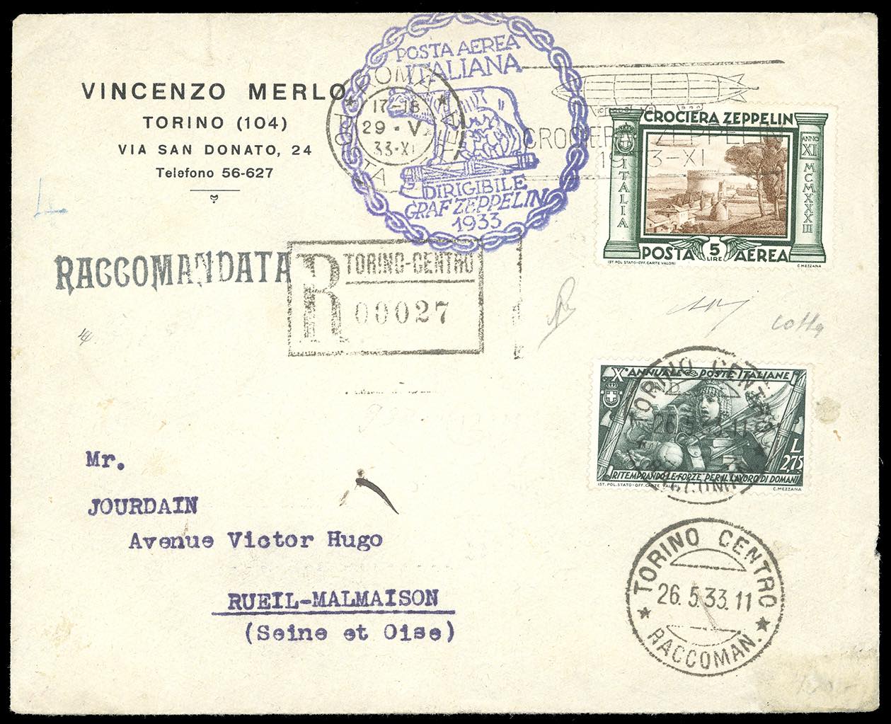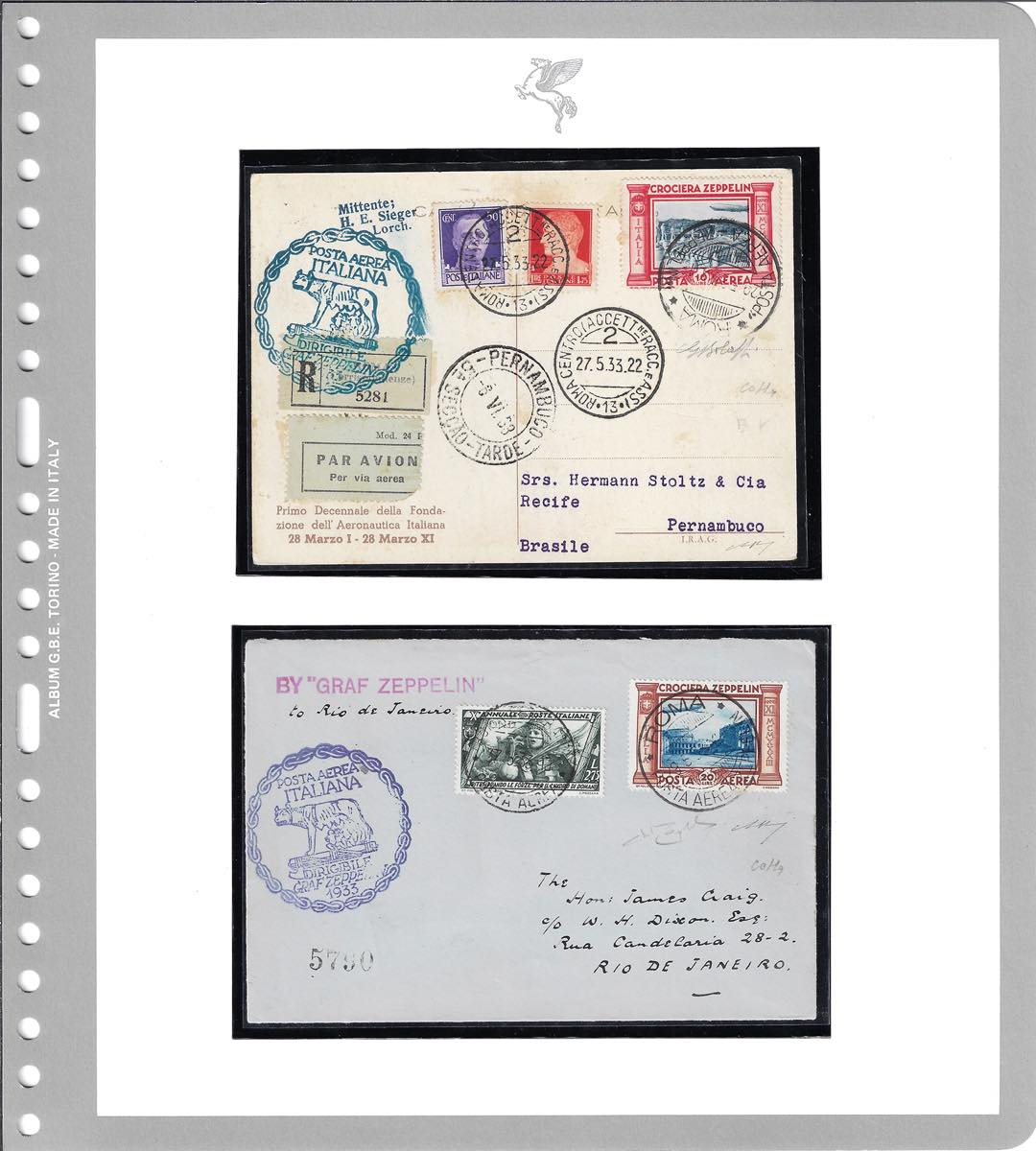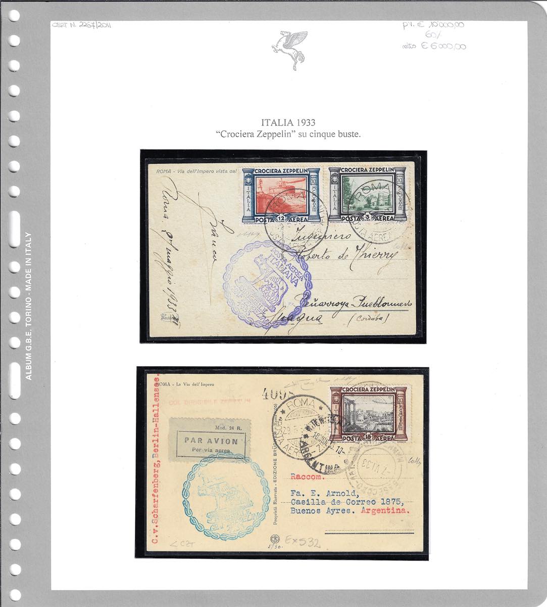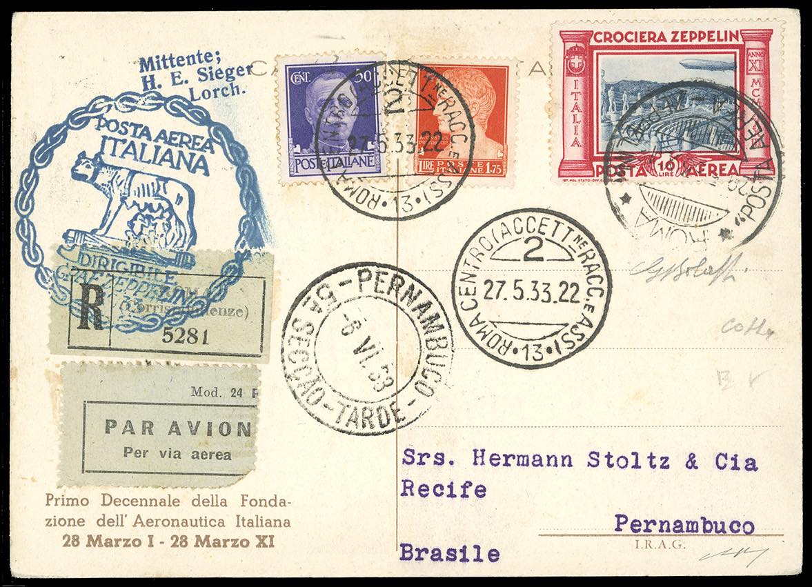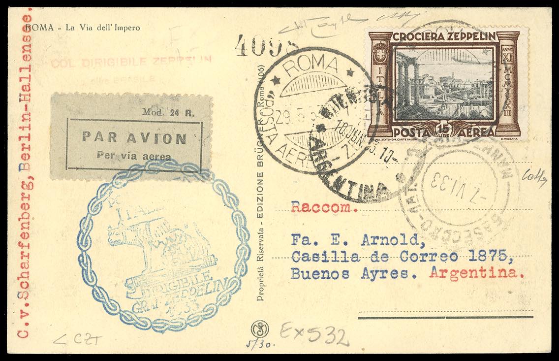 1933 - Crociera Zeppelin, serie completa (A45/A50), con valori complementari, su 5 aerogrammi da Roma, viaggiati con il Graf Zeppelin, diretti in Spagna, Argentina, Francia e due in Brasile. Ottima qualità. Firmati Colla/Bolaffi/Raybaudi. Cert. finanziario Bolaffi.