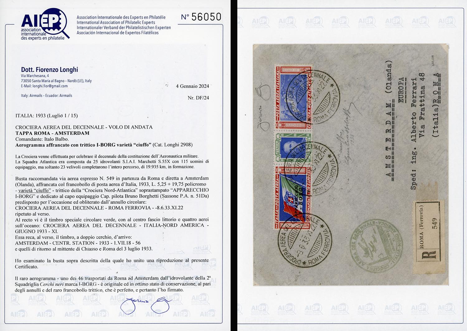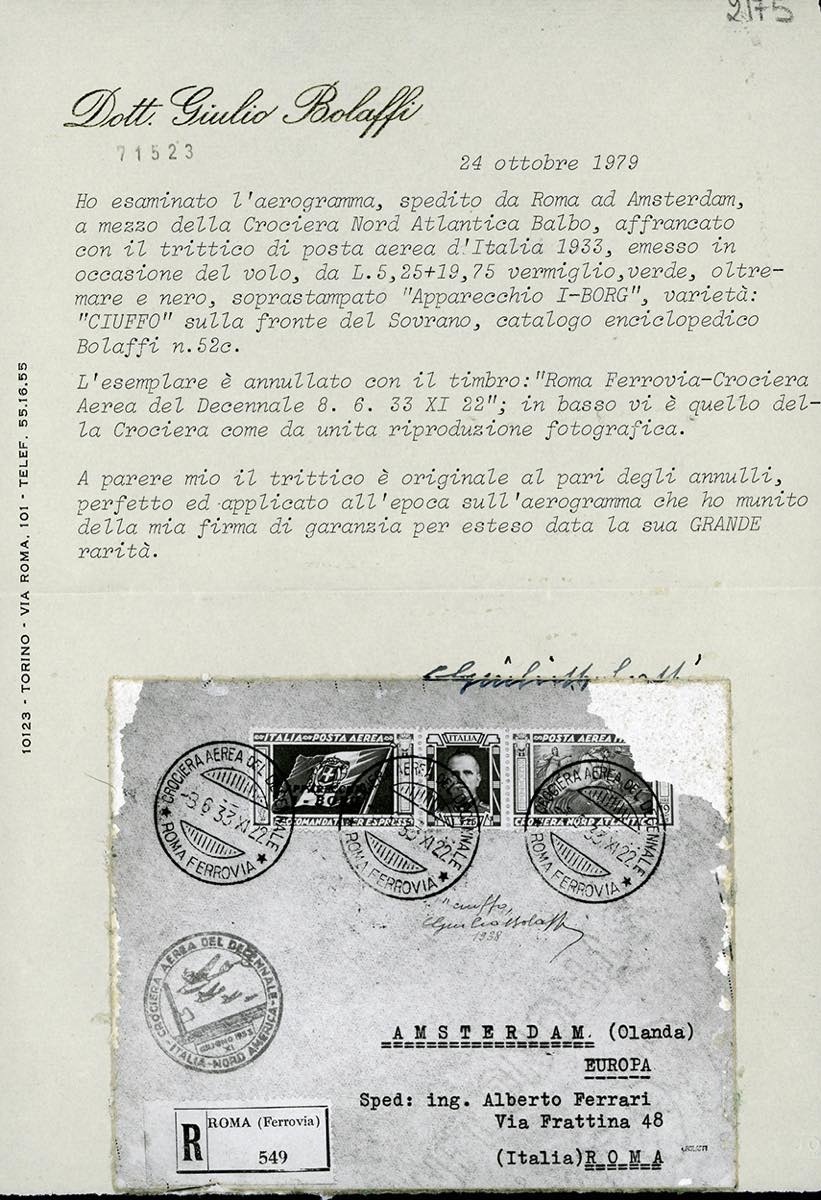 1933 - 5,25 + 19,25 lire Trittico I-BORG, varietà "CIUFFO" (51Da), perfetto, su aerogramma raccomandato da Roma 8/6/1933, trasportato fino ad Amsterdam durante la Crociera Nord Atlantica, bolli speciali sul fronte e di transito al verso.