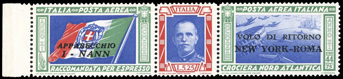 1933 - 5,25 + 44,75 lire Trittico I-NANN, soprastampato "VOLO DI RITORNO", non emesso (53), bordo di foglio a sinistra, nuovo, gomma originale integra, perfetto.