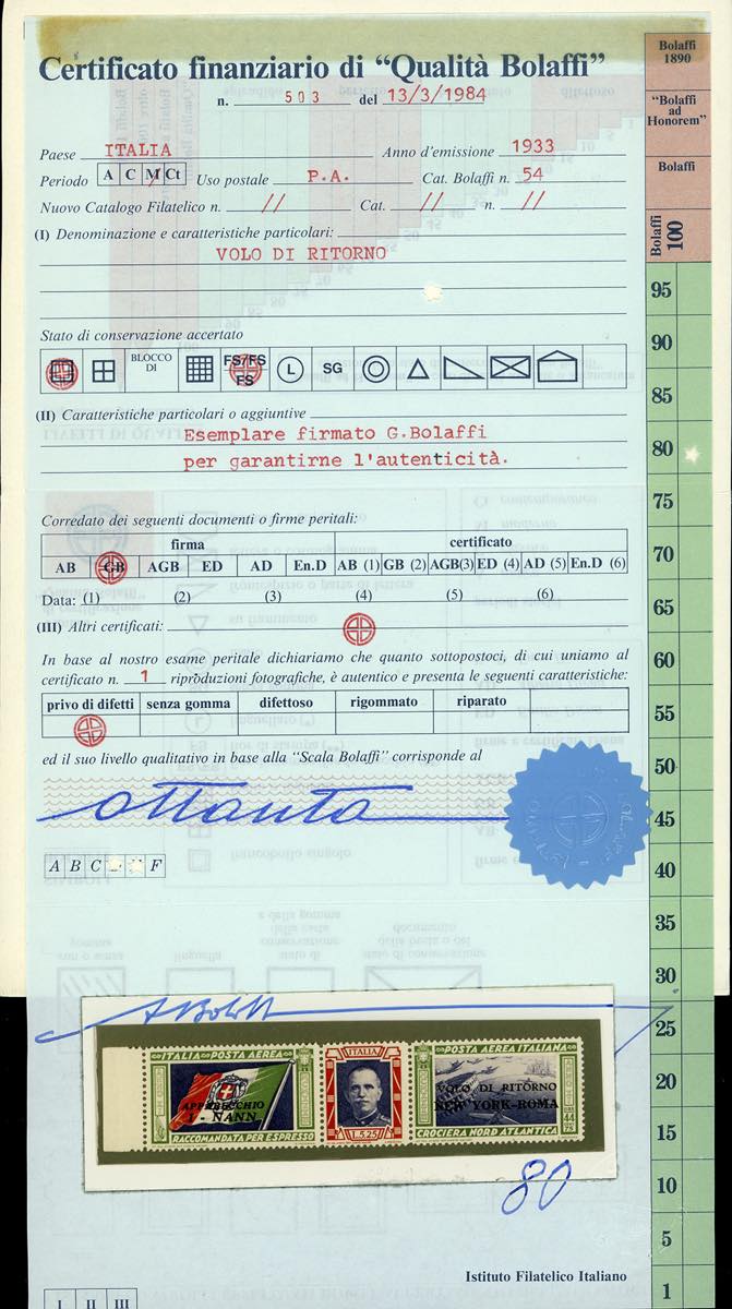 Firmato Giulio Bolaffi, G.Oliva, cert. finanziario Bolaffi 80%.