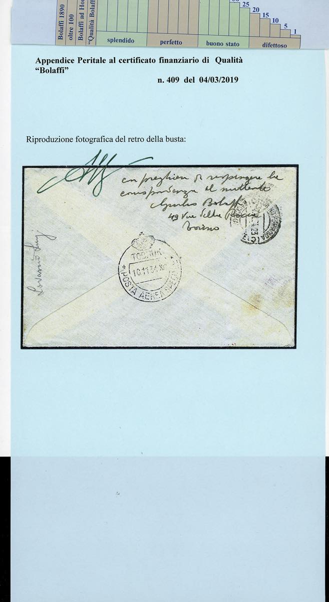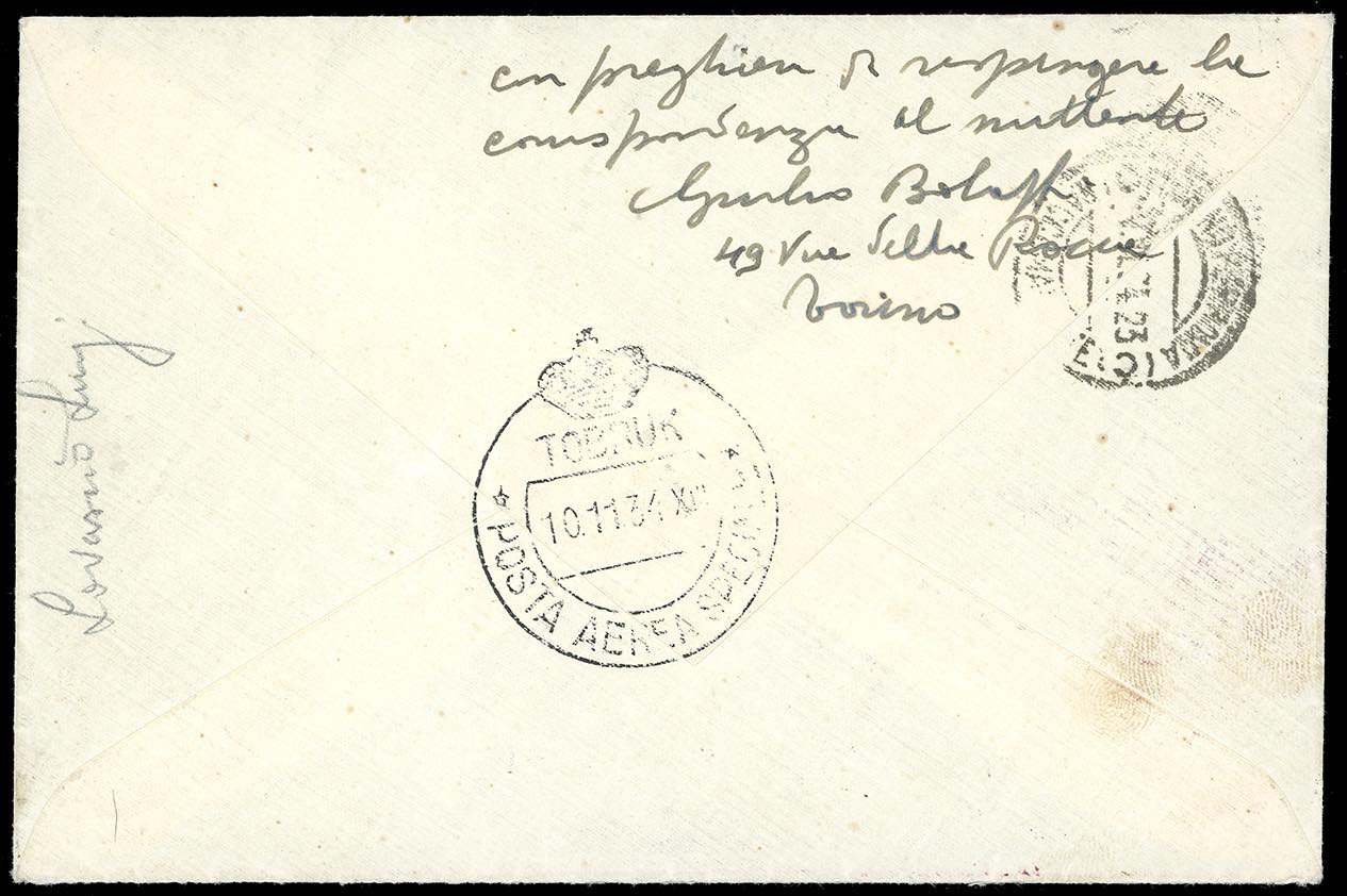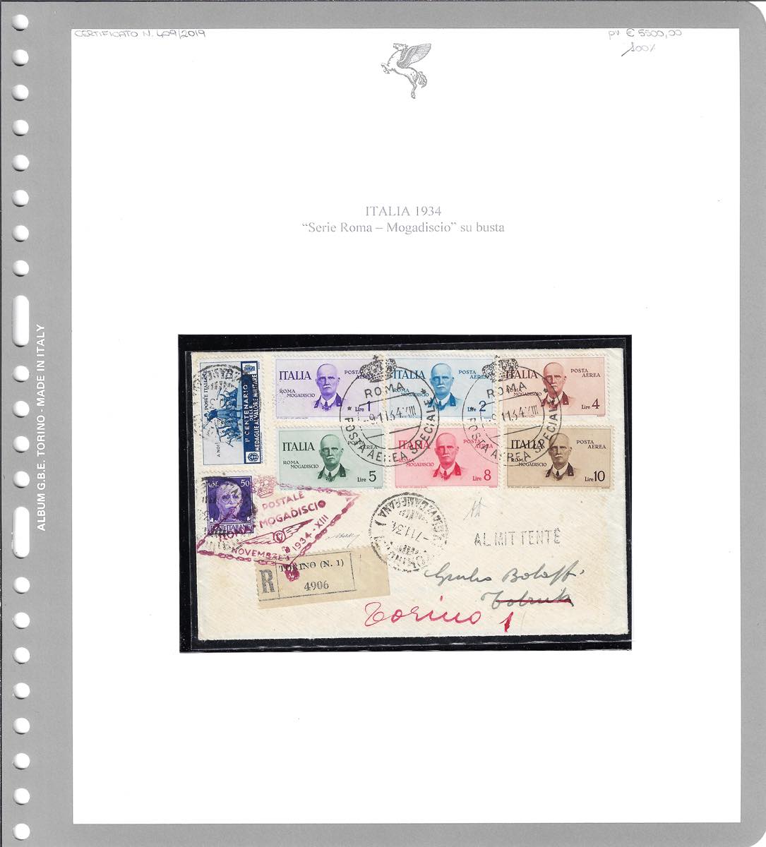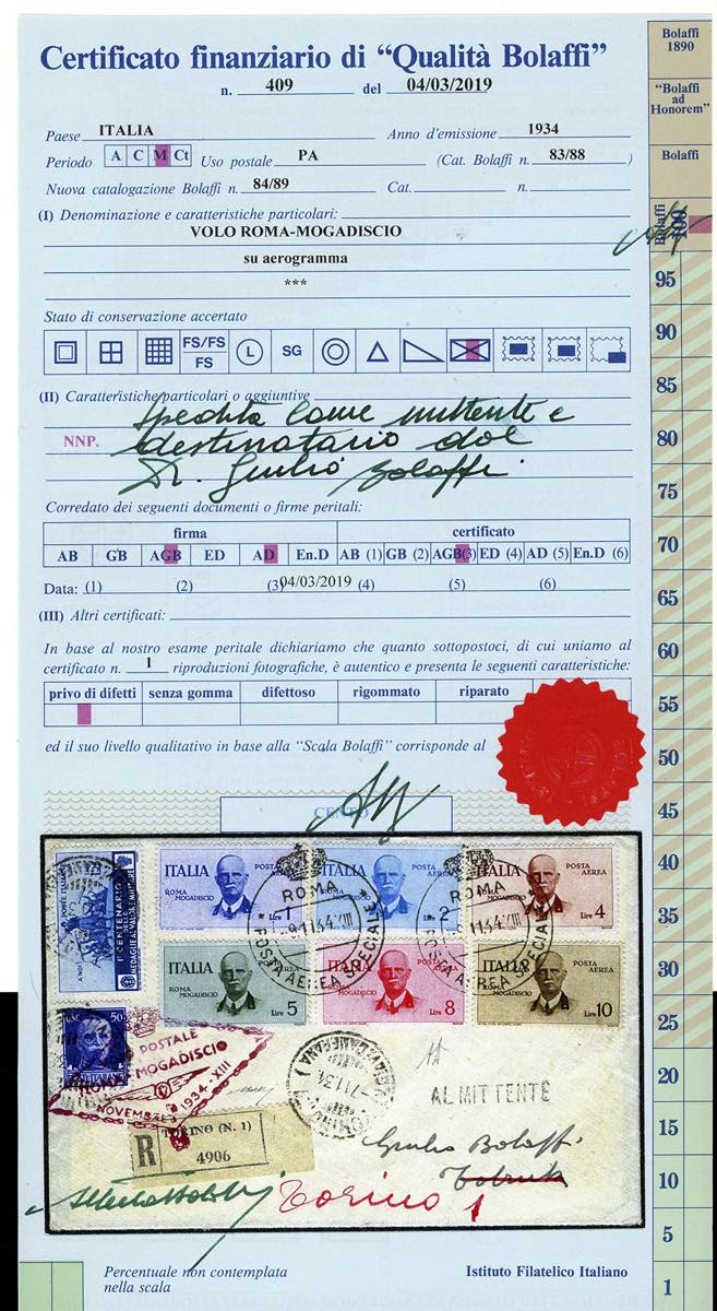 1934 - Aerogramma volo Roma-Mogadiscio, affrancato con la serie completa e valori complementari (A83/A88,373,251), perfetti, da Torino 7/11/1934 a Mogadiscio, restituito al mittente Giulio Bolaffi, con bolli speciali d'arrivo. Molto bello. A.Diena, cert. finanziario Bolaffi.
