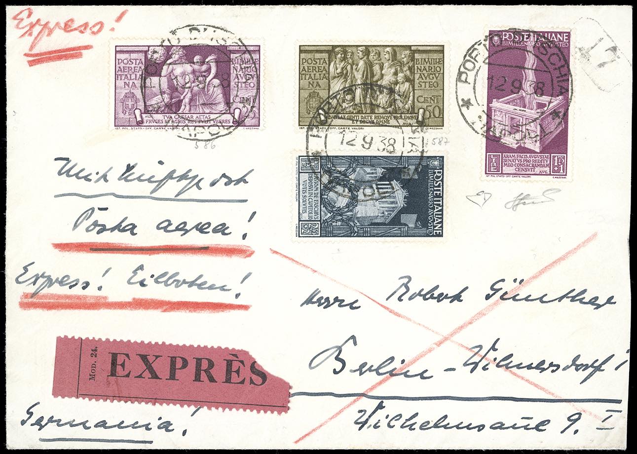1938 - Augusto, quattro valori (A106,A107,424,425), perfetti, su aerogramma espresso da Porto D'Ischia 12/9/1938 a Berlino, in Germania, bollo d'arrivo al verso. Rara affrancatura. E.Diena, Ferrario.