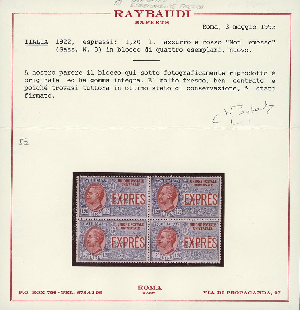 Lotto 249 - 1922 - 1,20 lire, non emesso (8), ben centrato, blocco di ...