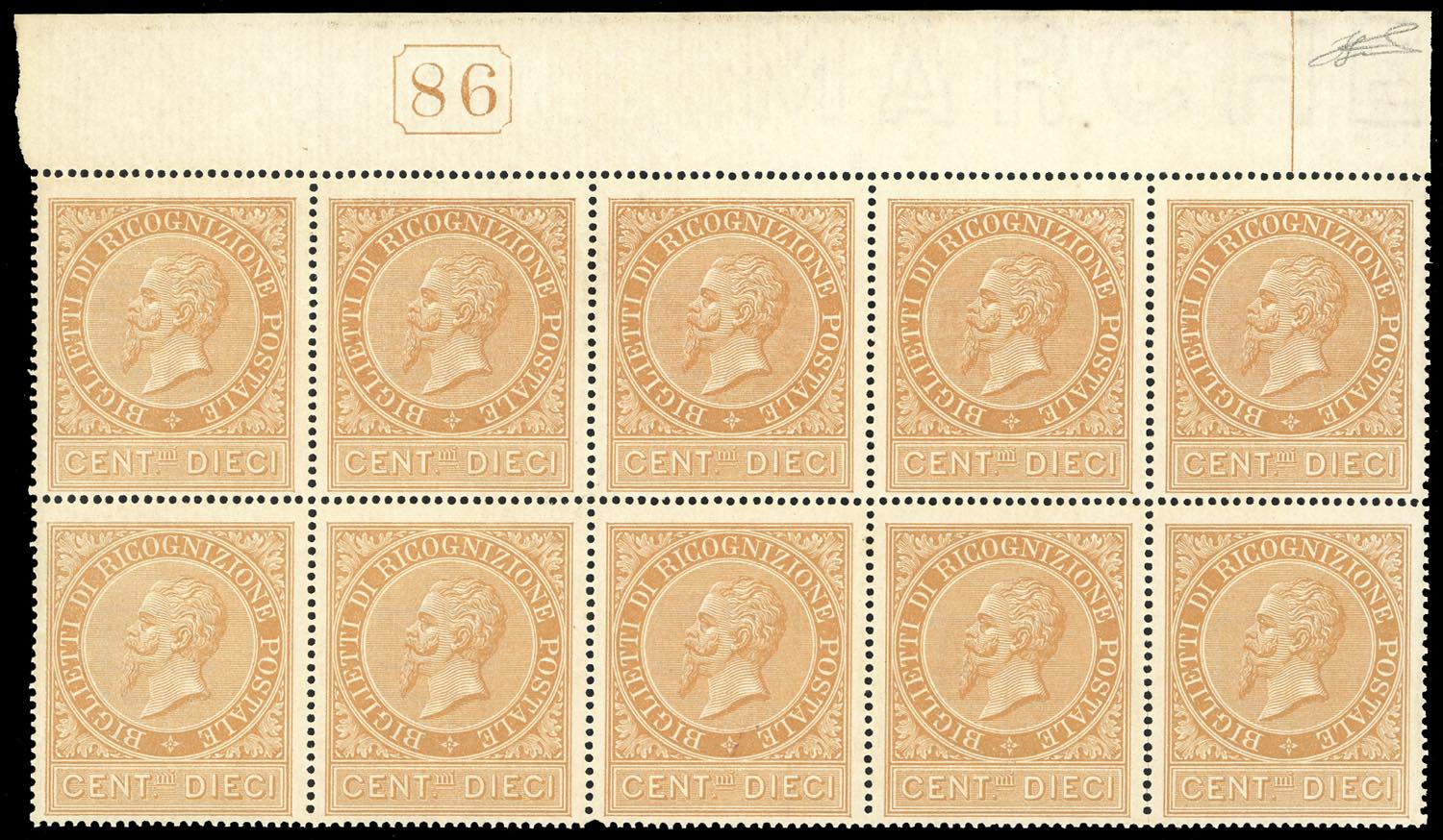 1874 - 10 cent. ocra arancio (1), eccezionale blocco di 10 esemplari, bordo di foglio superiore con numero di tavola in rettangolo 86, ... Leggi tutto