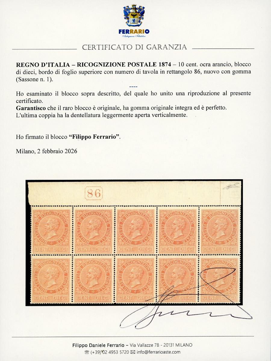 1874 - 10 cent. ocra arancio (1), eccezionale blocco di 10 esemplari, bordo di foglio superiore con numero di tavola in rettangolo 86, nuovo, gomma originale integra, perfetto. L'ultima coppia ha la dentellatura leggermente aperta verticalmente. Insieme splendido e raro. Cert. Ferrario.
