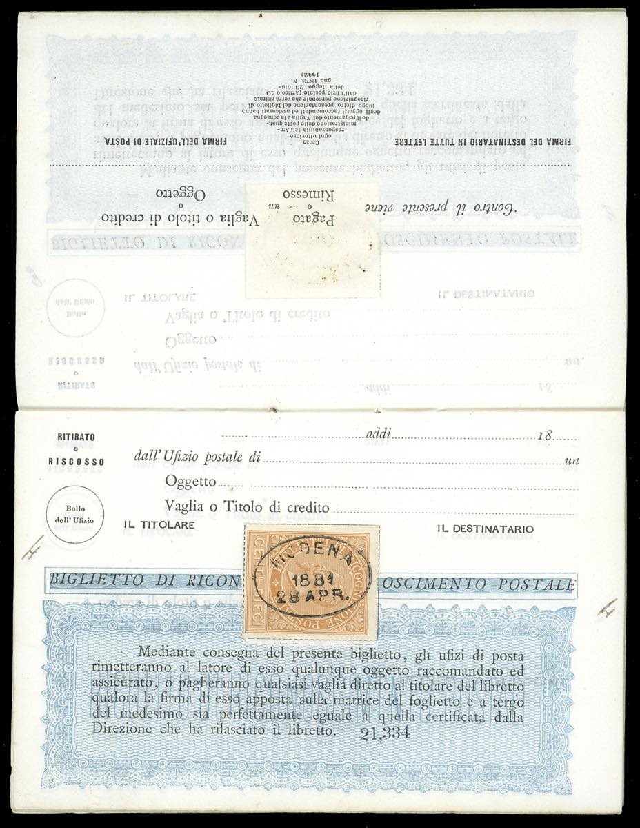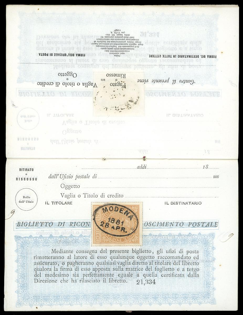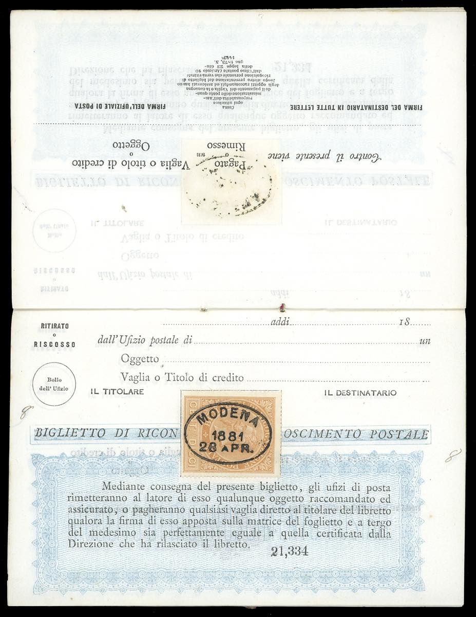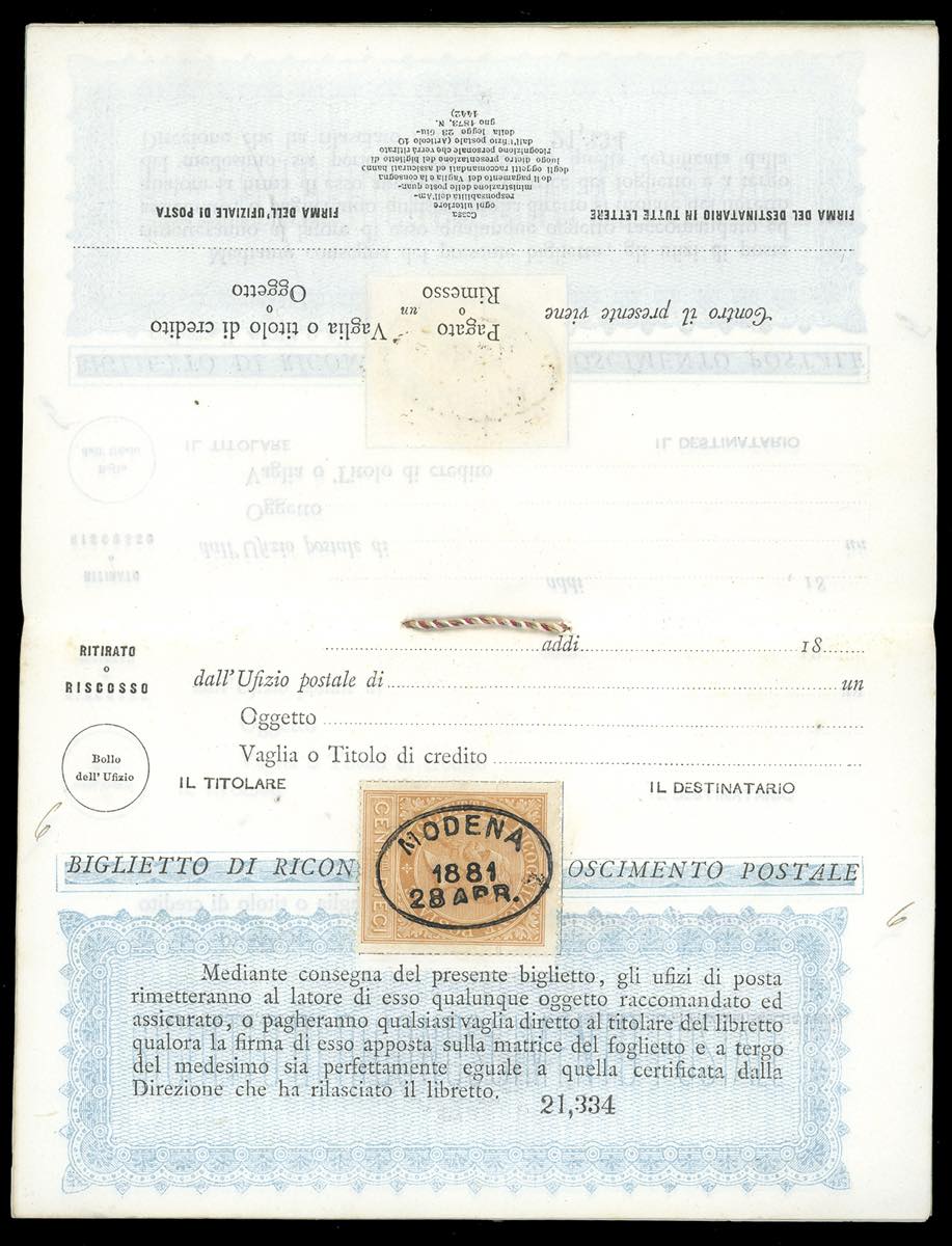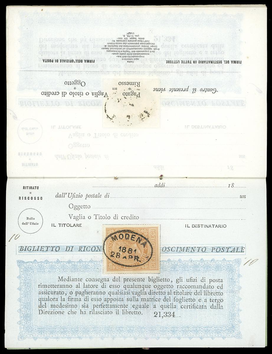 1881 - Libretto di ricognizione postale completo delle 10 pagine interne, tutte con 10 cent. ocra arancio (1), con annullo ovale di Modena ... Leggi tutto