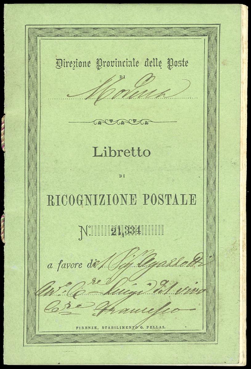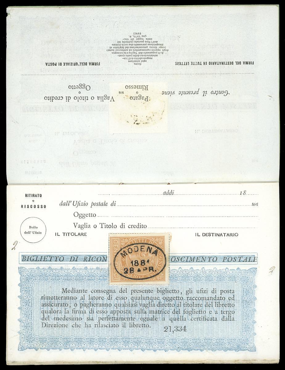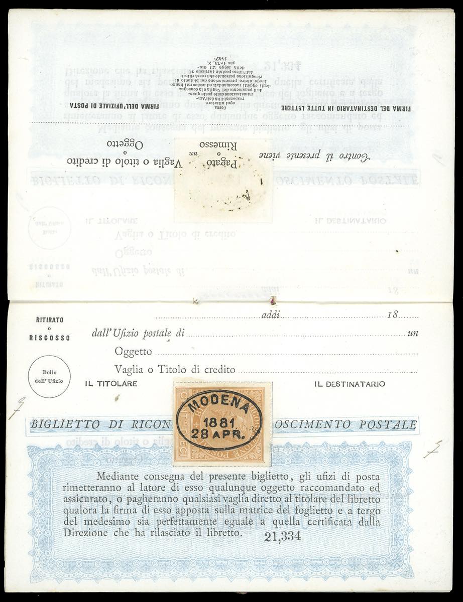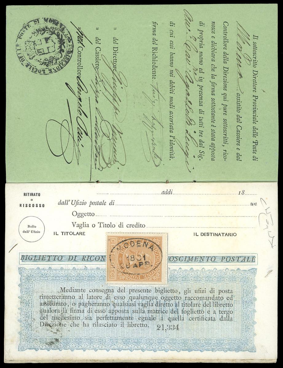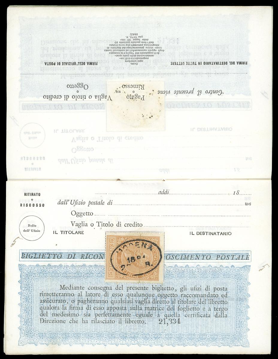 1881 - Libretto di ricognizione postale completo delle 10 pagine interne, tutte con 10 cent. ocra arancio (1), con annullo ovale di Modena ... Leggi tutto