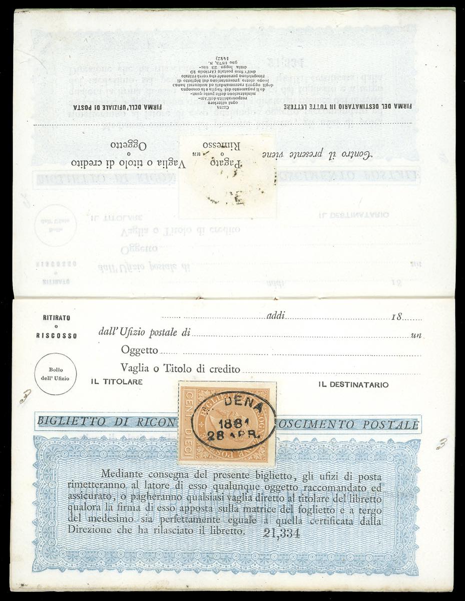 Lotto 266 - 1881 - Libretto di ricognizione postale completo delle 10 ...