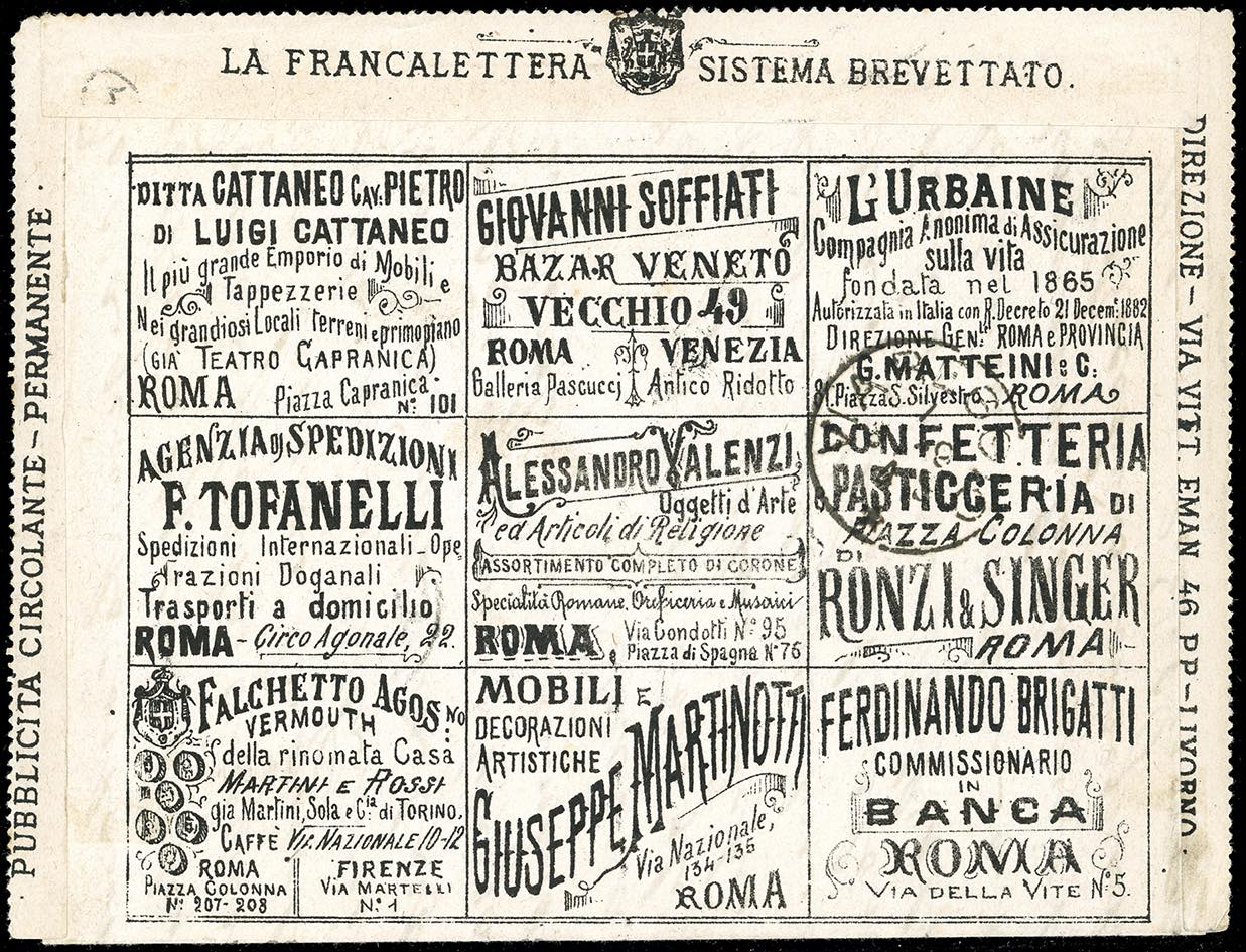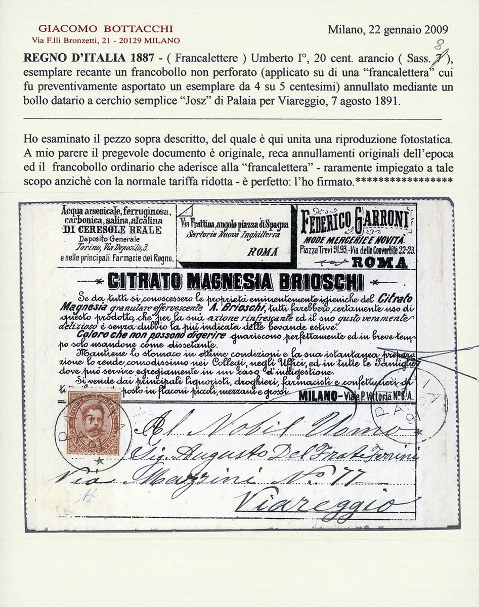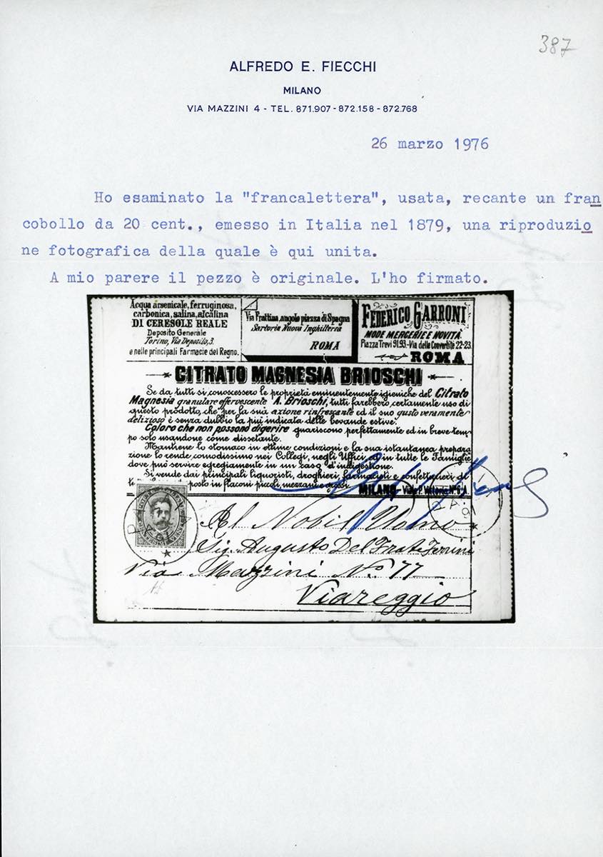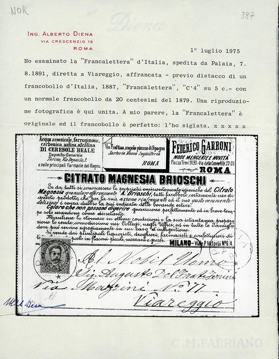 1891 - 20 cent. Umberto I, perfetto, su busta francalettere (8), da Palaia 7/8/1891 a Viareggio. Cert. A.Diena, Bottacchi e Fiecchi.