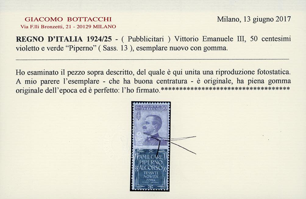 Lotto 286 - 1924 - 50 cent. Piperno (13), ben centrato, nuovo, gomma ...