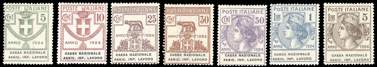 CASSA NAZIONALE ASSIC.INF.LAVORO 1924 - Serie completa (17/23), nuovi, gomma originale integra, perfetti. Cert. finanziario Bolaffi per l'alto valore.