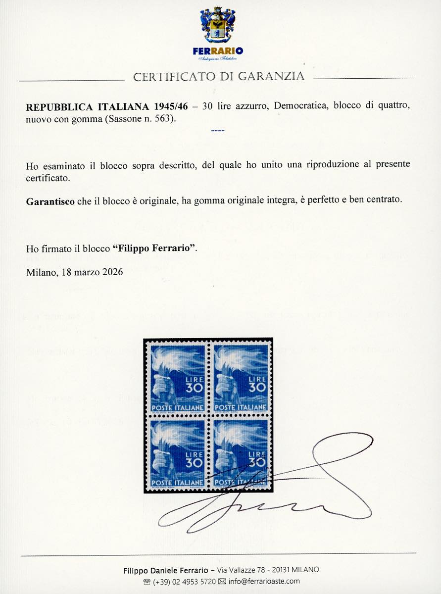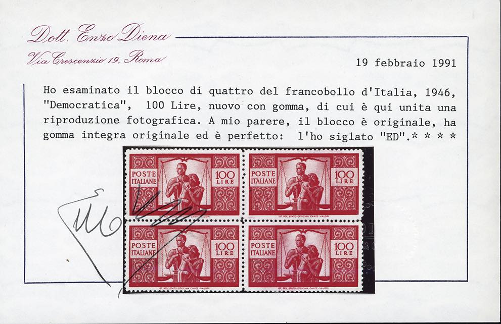 1945/48 - Democratica, serie completa (543/565), serie completa in blocchi di quattro, nuovi, gomma originale integra, perfetti. Molto freschi e ben centrati. Il 30 lire cert. Ferrario, il 100 lire cert. Enzo Diena.
