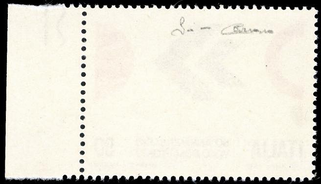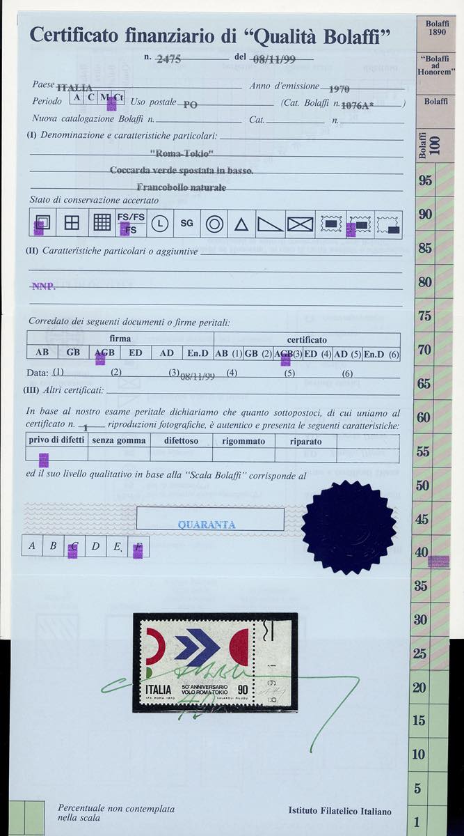 1970 - 90 lire volo Roma-Tokio, stampa del verde fortemente spostata in basso (Sass. 1121a), bordo di foglio a destra, nuovo, gomma originale integra, perfetto. Molto raro, pochissimi esemplari noti. Firmato Carraro, cert. finanziario Bolaffi.