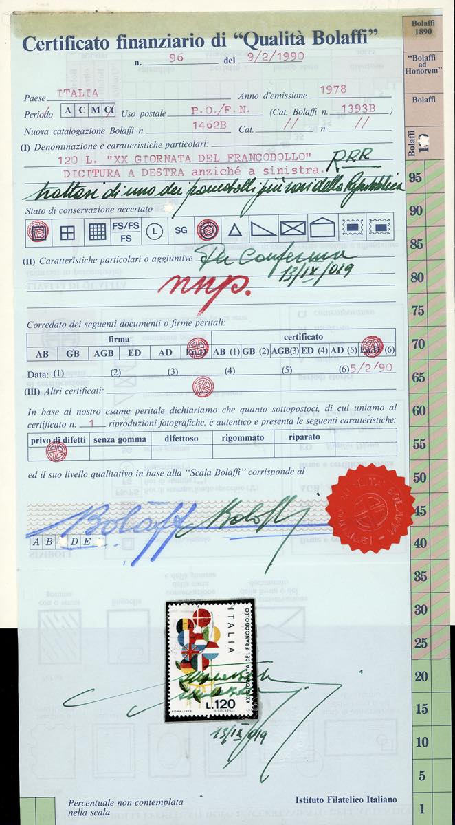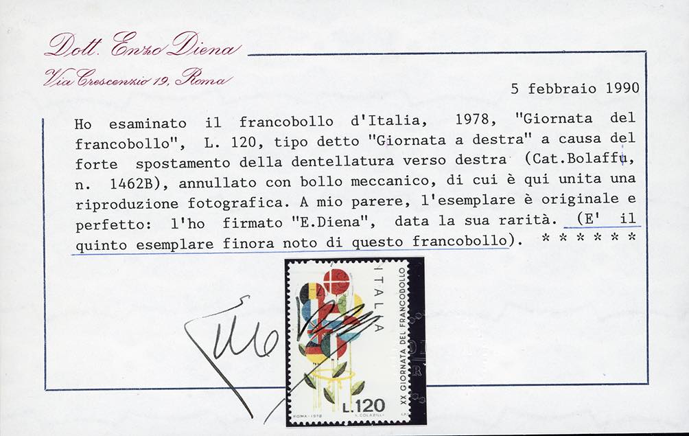 1978 - 120 lire Giornata del francobollo, dentellatura verticale fortemente spostata a destra, francobollo naturale "Giornata a destra" (Sass. 1435a, Bol. 1535B), usato, perfetto.