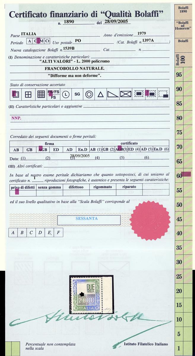 1979 - 2.000 lire Alti Valori, senza testa, francobollo naturale (Bol. 1539B), bordo di foglio, nuovo, gomma originale integra, perfetto. Raro e di ottima qualità. Cert. finanziario Bolaffi.