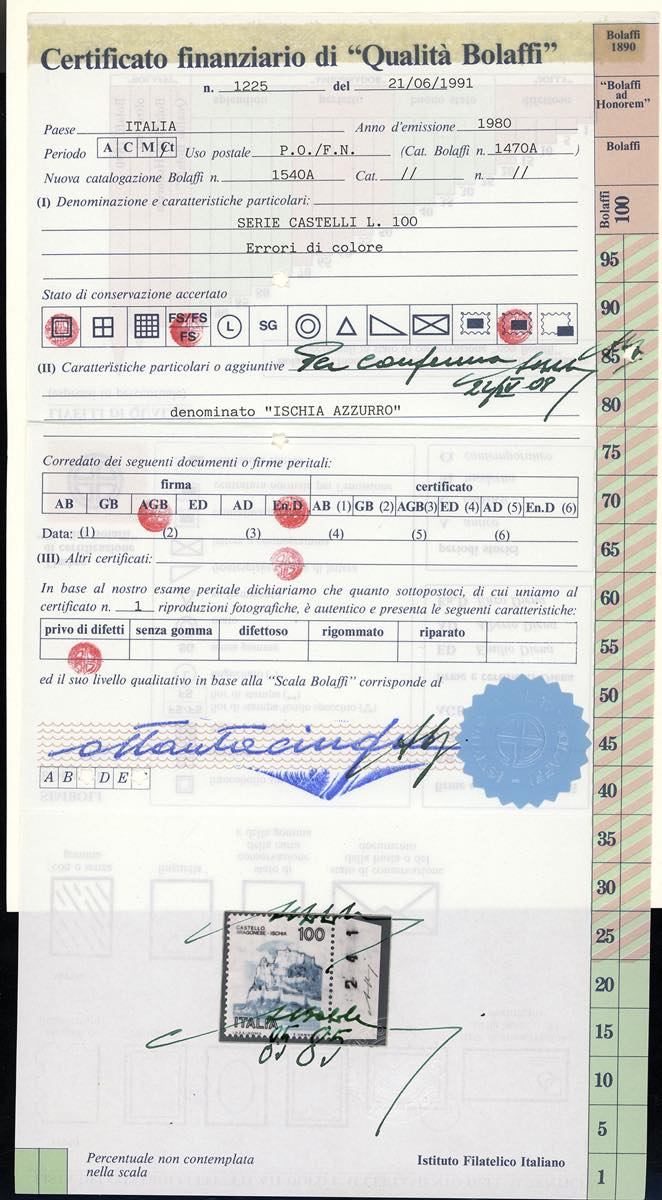 1980 - 100 lire Castelli, francobollo naturale "Castello azzurro" (Bol. 1614B), bordo di foglio, gomma originale integra, perfetto. Raro e di ottima qualità. Firmato Enzo Diena, cert. finanziario Bolaffi 85%.