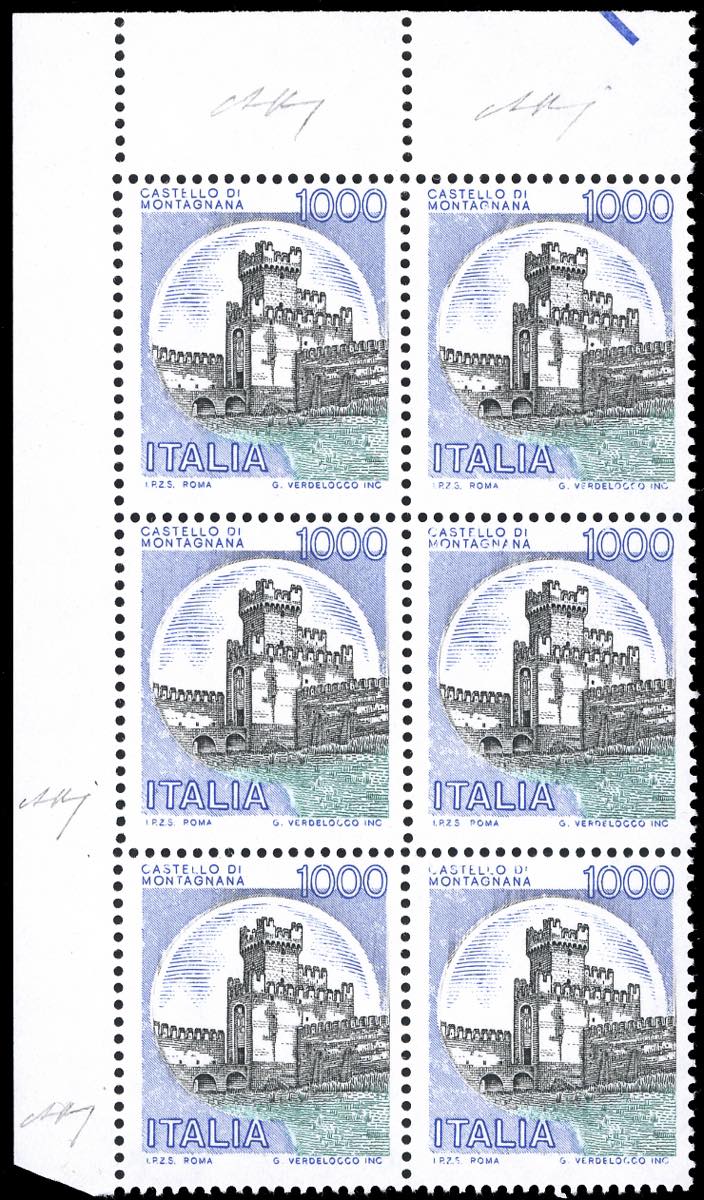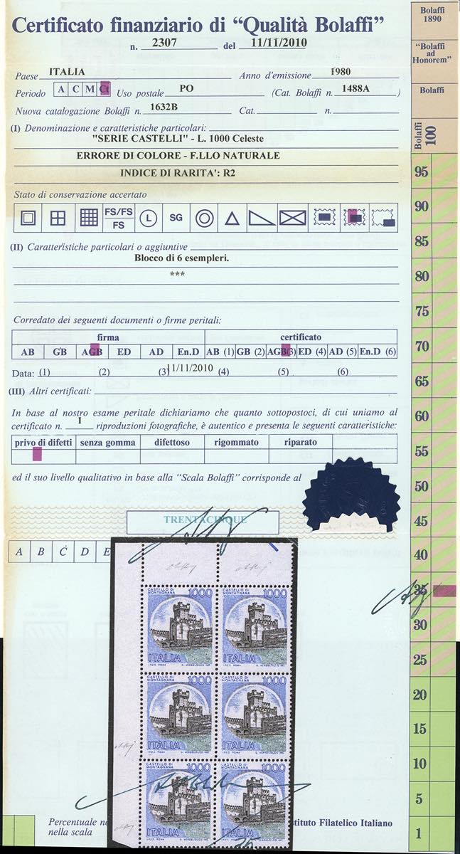 1980 - 1.000 lire Castelli, francobollo naturale "Castello celeste" (Bol. 1632B), blocco di sei esemplari, angolo di foglio, nuovo, gomma originale integra, perfetto. Molto bello e raro. Cert. finanziario Bolaffi.