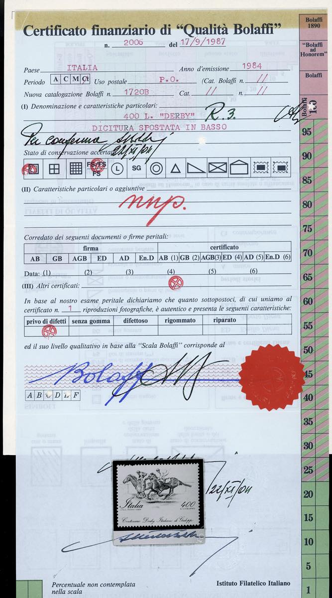 1984 - 400 lire Derby, dentellatura orizzontale fortemente spostata in basso, dicitura in basso, francobollo naturale "Derby in pista" (Sass. 1684a, Bol. 1794B), nuovo, gomma originale integra, perfetto. Splendido e raro. Cert. finanziario Bolaffi 100%.